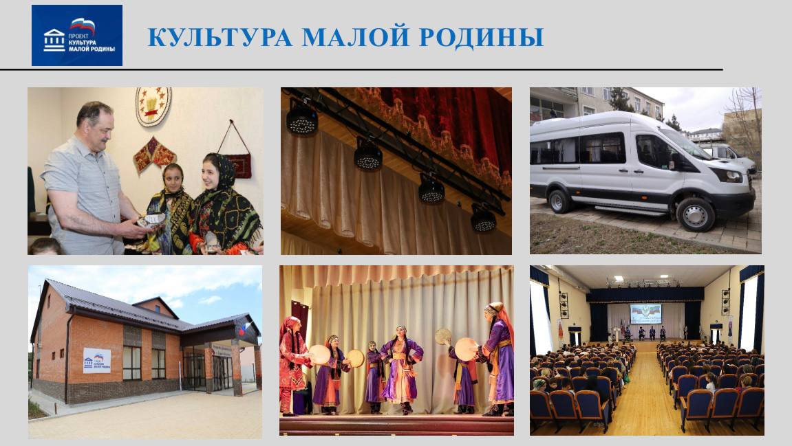 Благодаря проекту «Театры малых городов» поддержку получают пять театров – Лезгинский, Азербайджанский, Табасаранский, Даргинский и Ногайский. Им ежегодно выделяют субсидии на приобретение оборудования, автотранспорта, создание новых спектаклей.