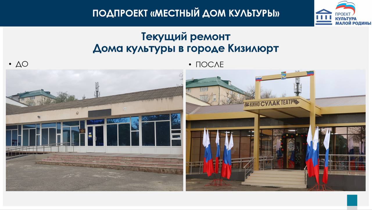 В настоящее время завершается ремонт 2 домов культуры в населенных пунктах с числом жителей до 50 тысяч человек - в Дагестанских Огнях, Ахвахском и Казбековском районах.