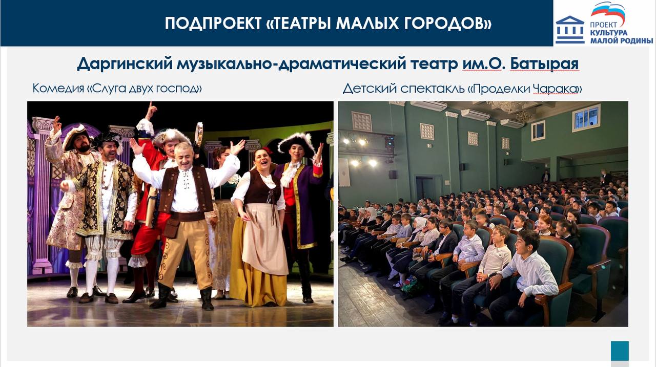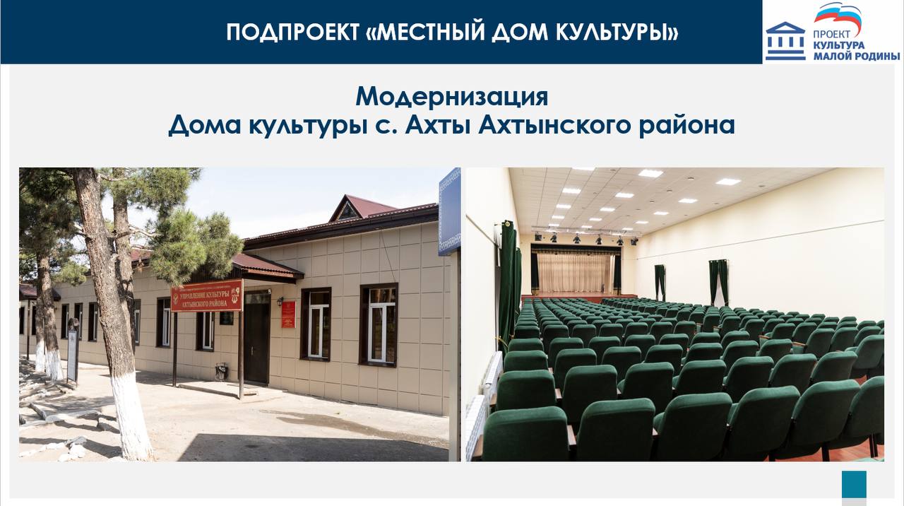 В 2025-м в республике была укреплена материально-техническая база 19 домов культуры в Агульском, Акушинском, Ахвахском, Ботлихском, Гергебильском, Дахадаевском, Казбековском, Курахском, Ногайском и Хивском районах.