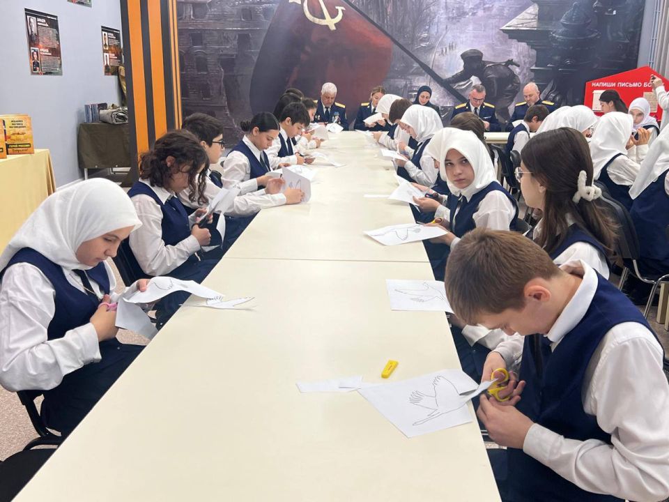 Затем офицеры совместно с школьниками изготовили бумажных журавликов и возложили их и цветы к стене памяти в Патриотическом центре школы, а также запустили воздушные шары во дворе школы.