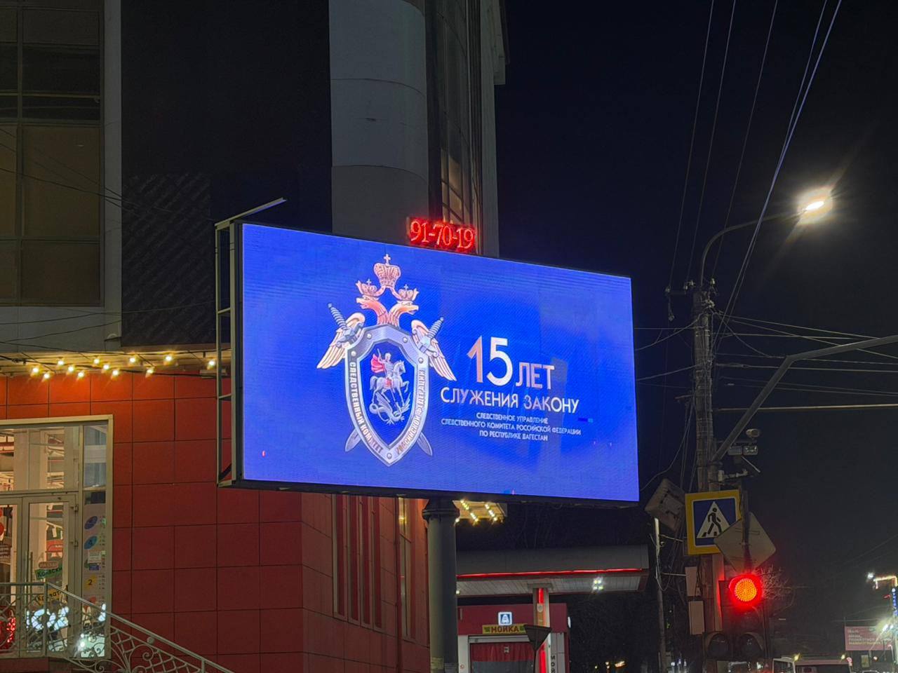 В городе Махачкале на рекламных щитах транслировался короткий видеоролик с гербом и поздравлением к 15-летию Следственного комитета Российской Федерации.