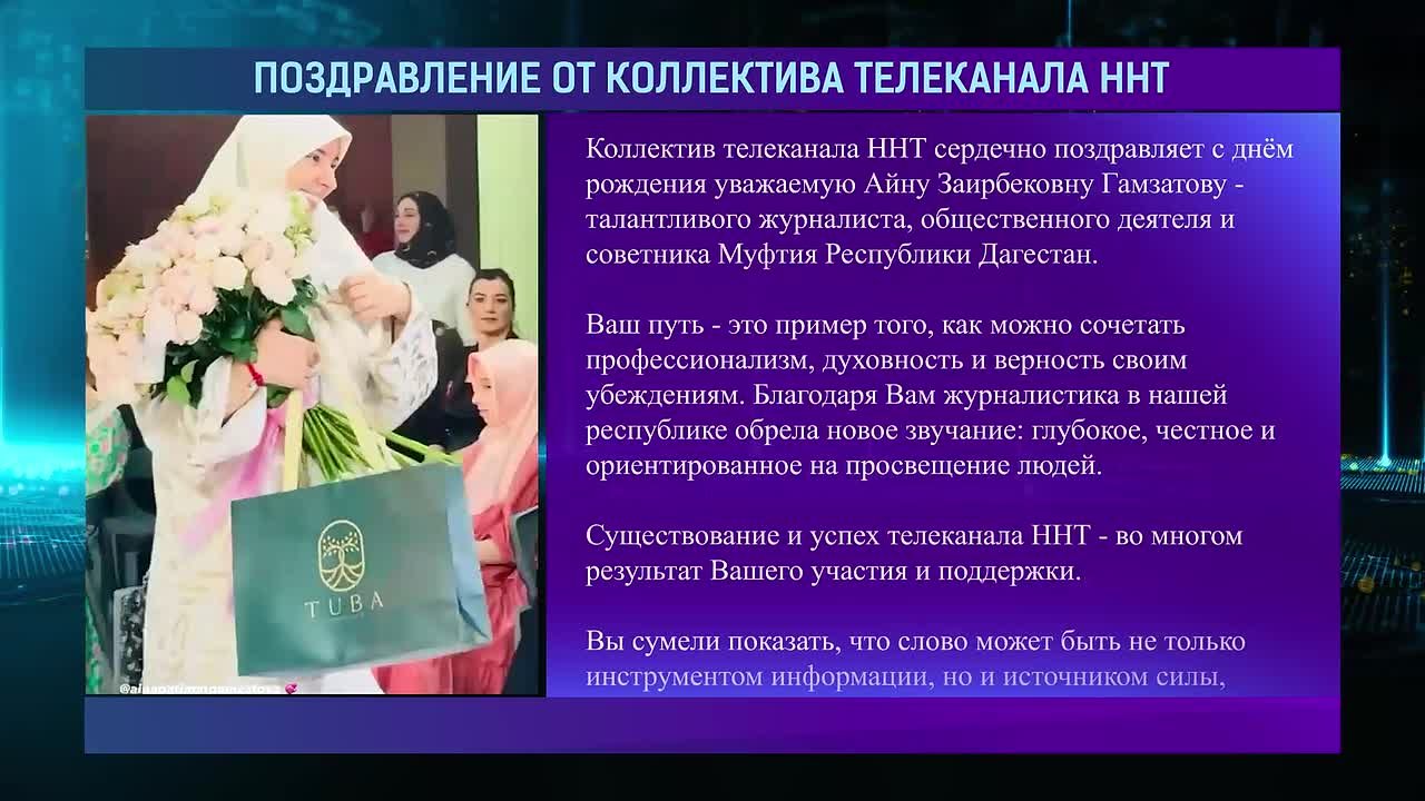 Коллектив телеканала ННТ сердечно поздравляет с днём рождения уважаемую Айну Заирбековну Гамзатову — талантливого журналиста, общественного деятеля и советника Муфтия РД!