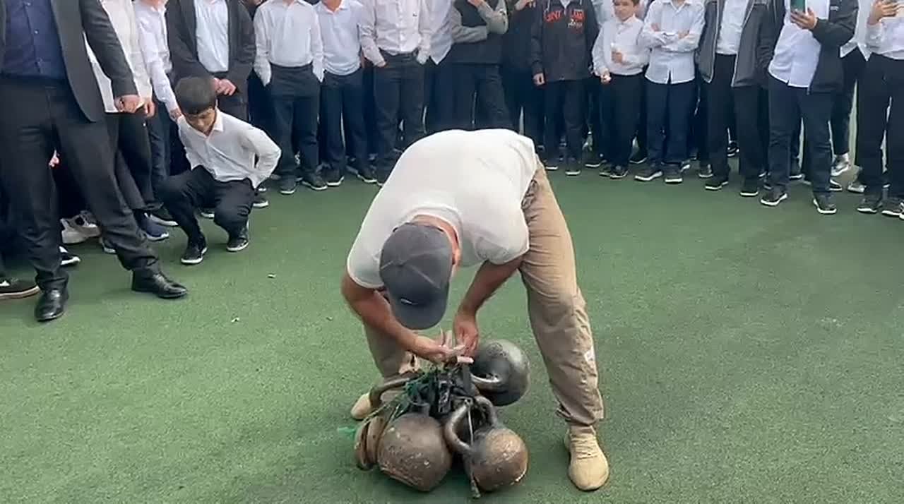 Дагестанский силач Султан Османов, чемпион Юга России и трехкратный чемпион Дагестана по гиревому спорту, продемонстрировал свои возможности в махачкалинской школе №49