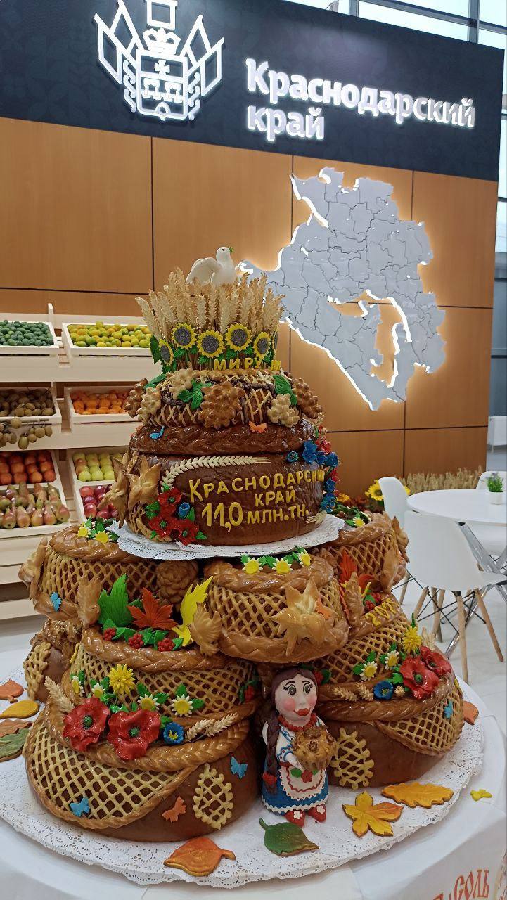 «Краснодарский край традиционно привёз на выставку каравай. Он посвящён собранному урожаю 2025 года, это 11 млн тонн продукции. Выпекали каравай на Анапском хлебокомбинате. Его вес 150 кг. Для выпечки использовалось сырье, выращенное только в Краснодарском крае», – рассказала Алёна Баскакова.