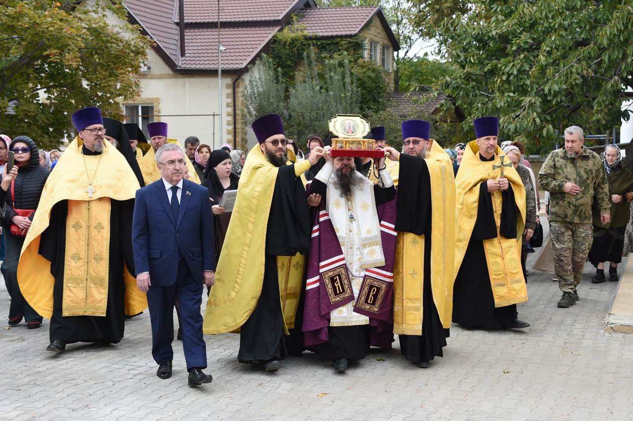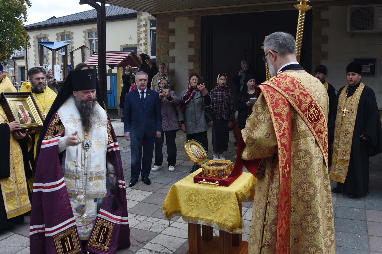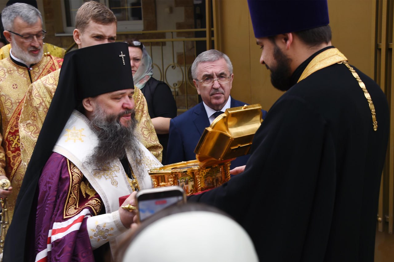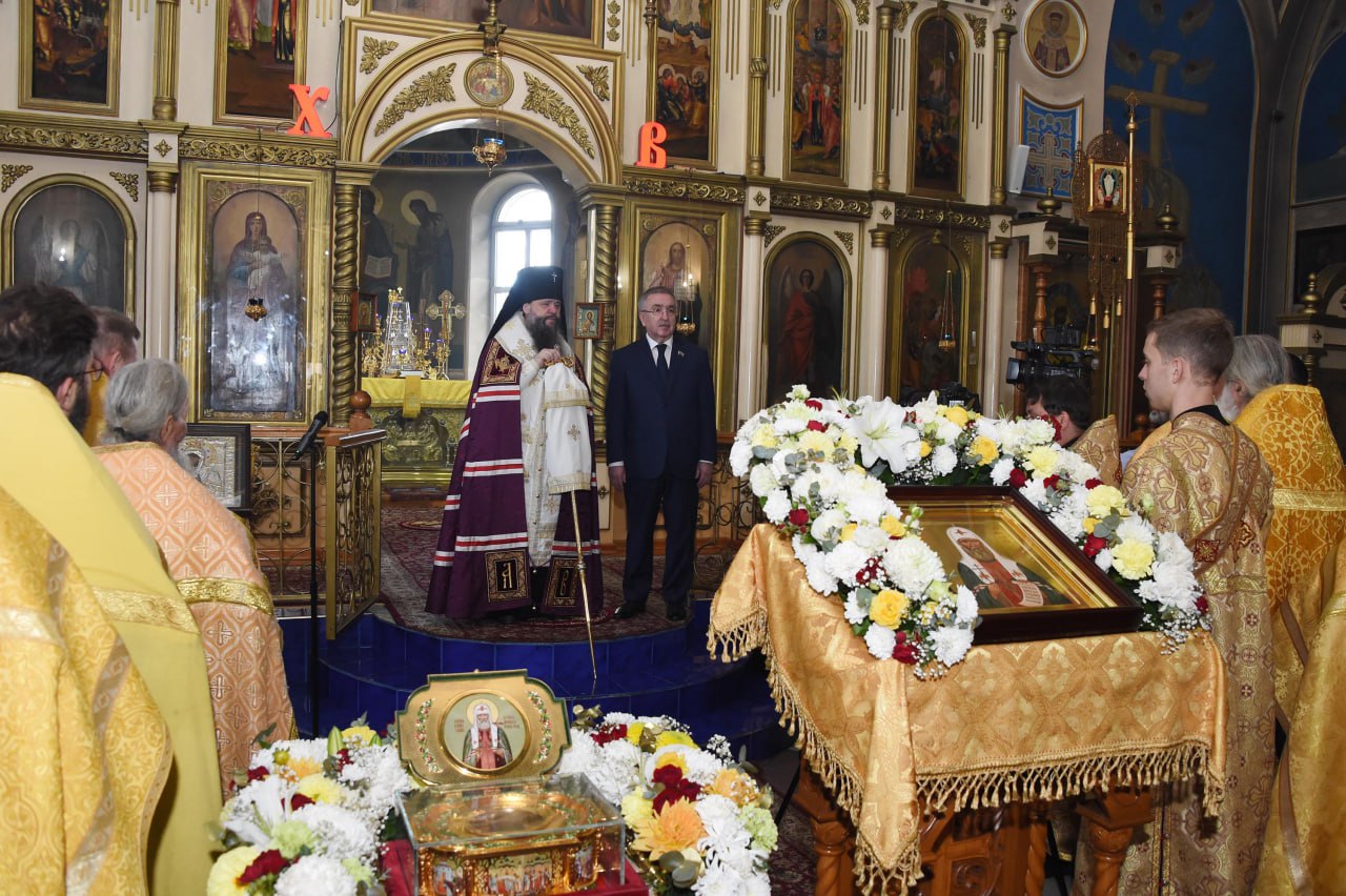 Архиепископ Махачкалинский и Дербентский Варлаам и Первый заместитель Председателя Народного Собрания Республики Дагестан Юрий Левицкий встретили в Свято-Успенском кафедральном соборе Махачкалы ковчег с частицей мощей святителя Тихона, Патриарха Московского и всея России.
