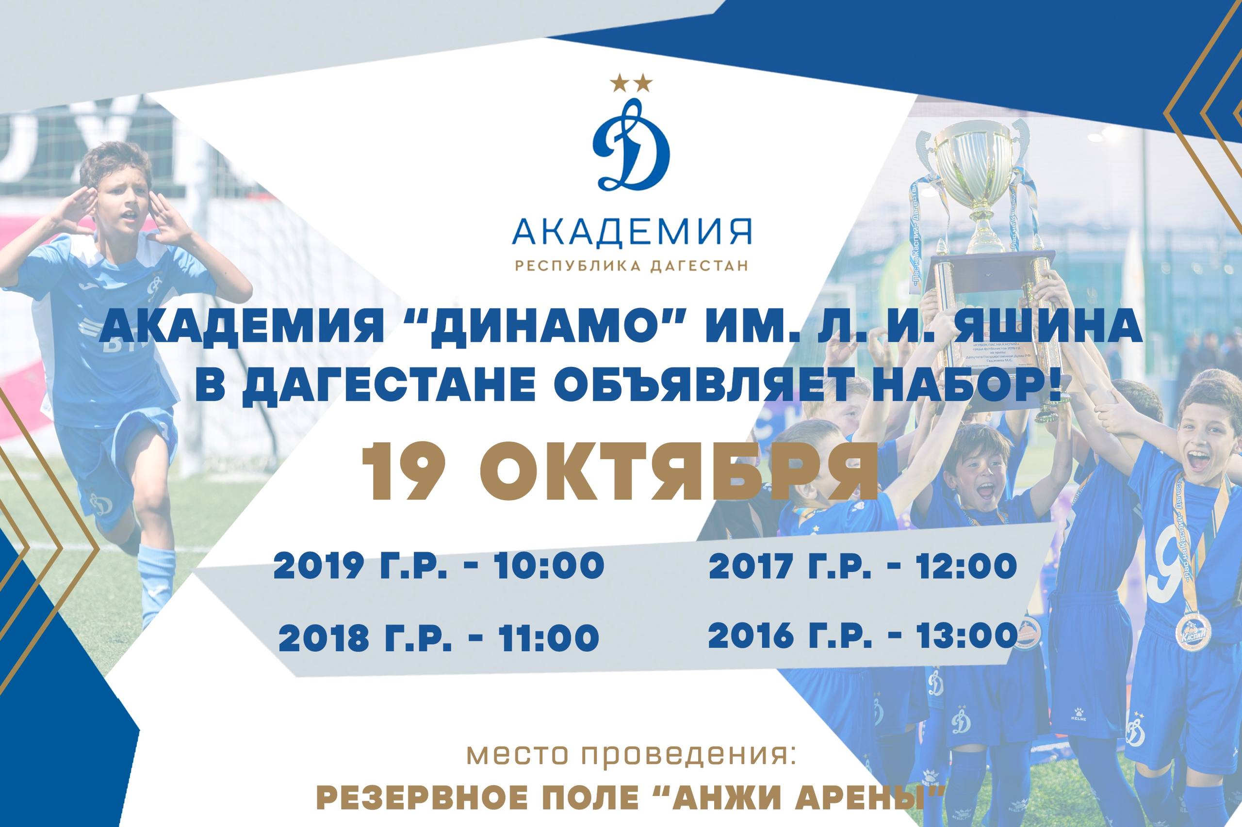 19 октября (воскресенье) на базе стадиона «Анжи Арена» состоятся просмотры ребят 2016-2019 г.р. в дагестанский филиал футбольной Академии «Динамо» им. Л. И. Яшина.