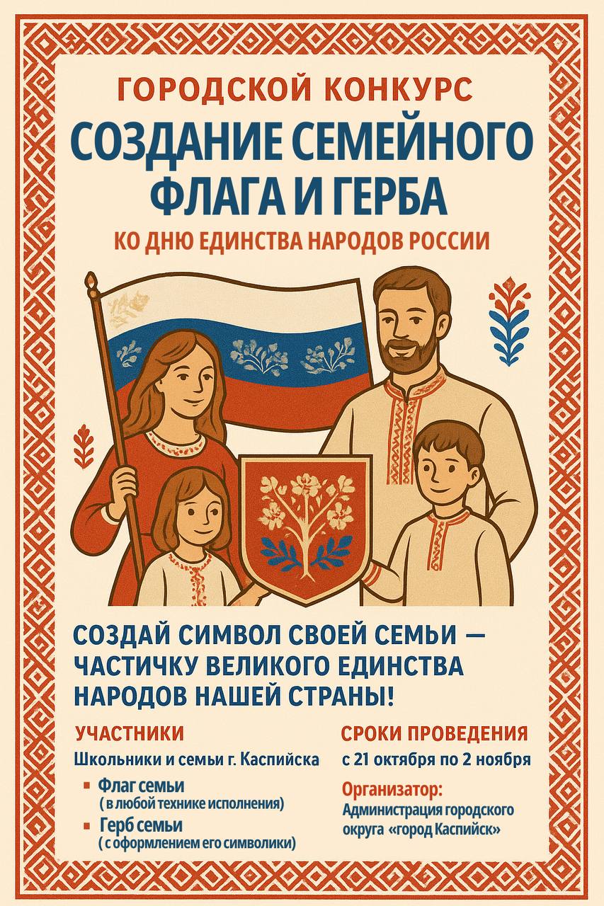 Администрация городского округа «город Каспийск» в лице МКУ «Управление культуры, молодежной политики, физической культуры, спорта и туризма» и МКУ «Управление образования» объявляет о проведении конкурса среди учащихся школ города и их семей на создание семейного национального флага и герба, приуроченного ко Дню единства народов России.