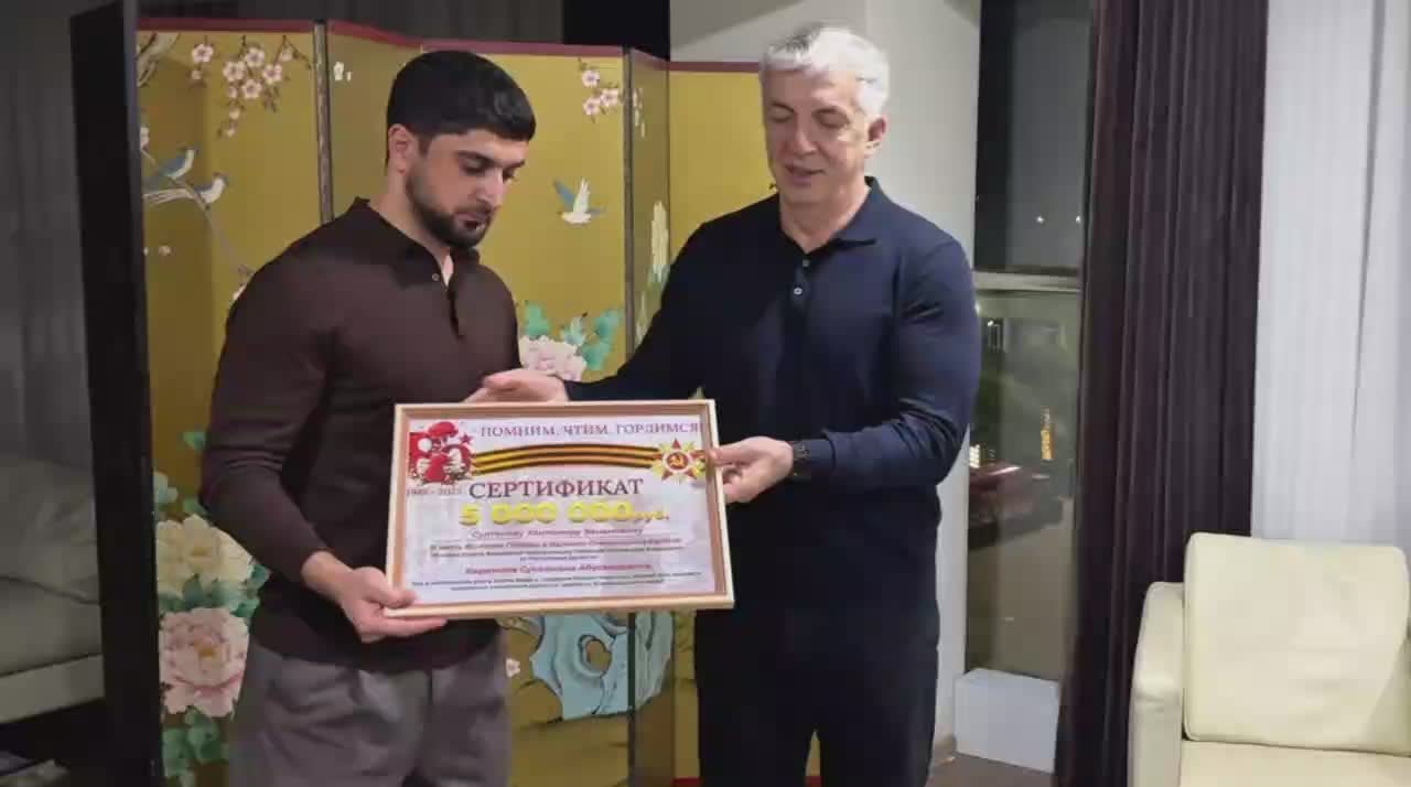 Сенатор от Дагестана Сулейман Керимов подарил Герою России Хантемиру Султанову (командиру штурмового отряда 40-й бригады морской пехоты) сертификат на 5 миллионов рублей. Об этом сообщил депутат Госдумы Хизри Абакаров.