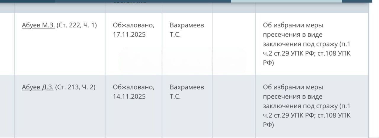 В Москве задержаны и арестованы бывший депутат парламента Дагестана Джафар Абуев, подозреваемый в хулиганстве, и его брат Магомед Абуев, бывший замглавы Ленинского района Махачкалы, подозреваемый в незаконном обороте оружия.