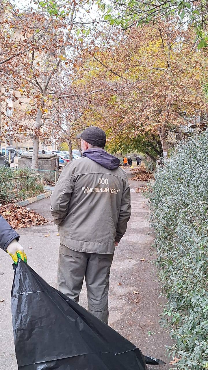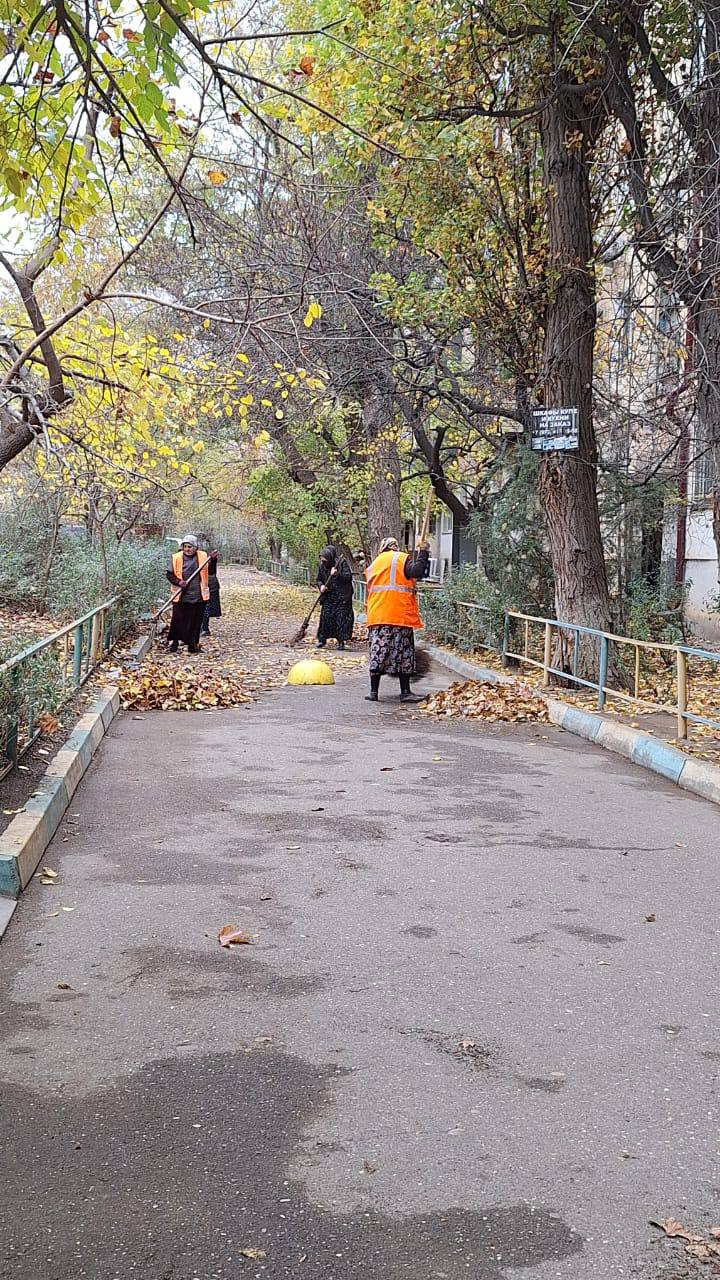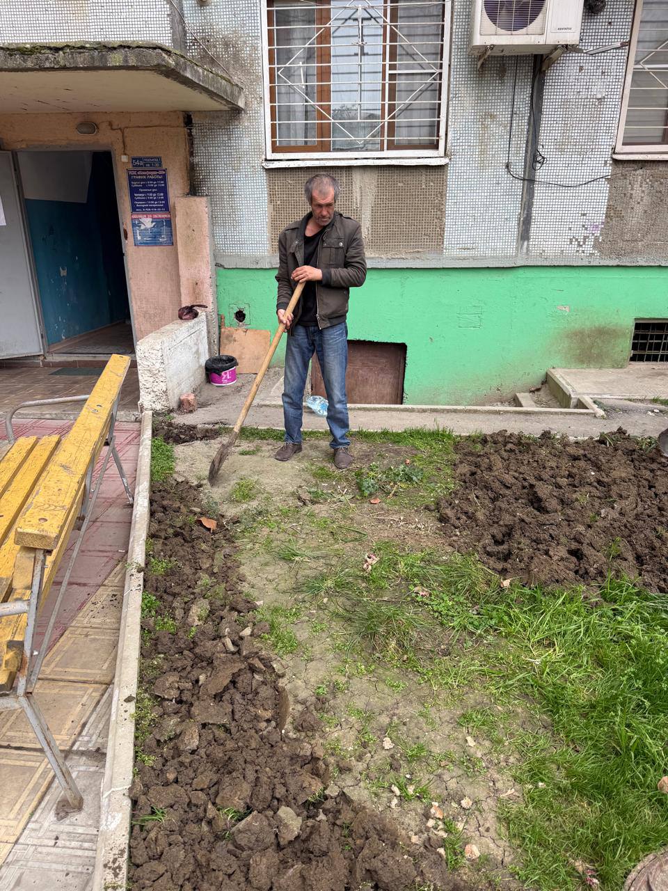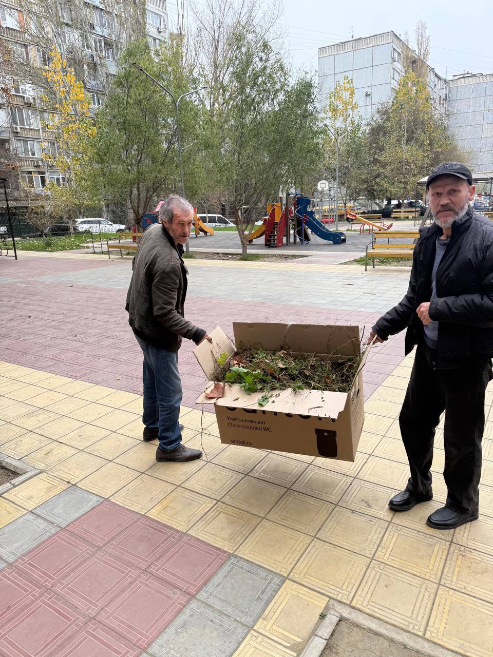 Работники управляющей компании совместно с жителями проводят санитарные работы на ул. Устарбекова 12.