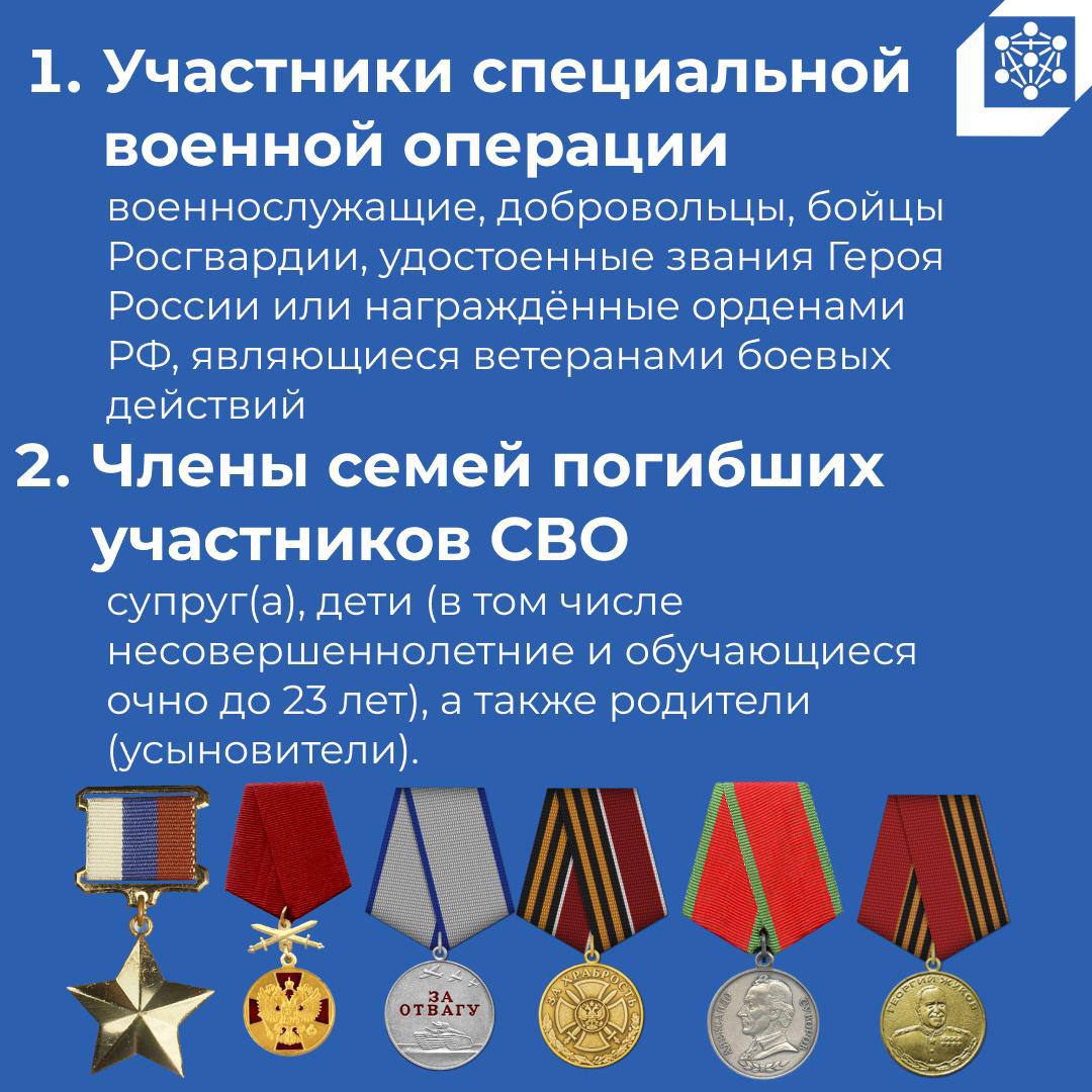 – участники СВО, добровольцы, бойцы Росгвардии, награждённые орденами Российской Федерации или удостоенные звания Героя России;