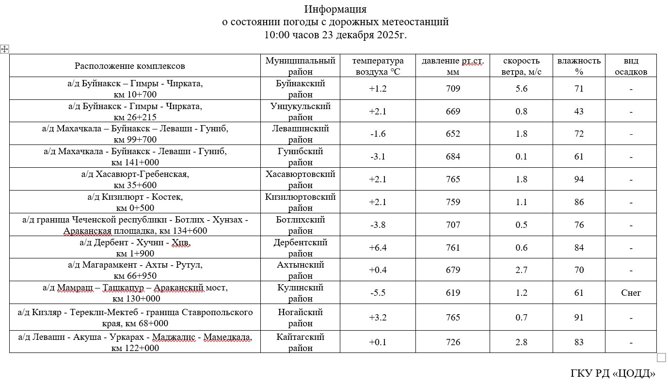 Информация о состоянии погоды с дорожных постов метеоконтроля на 23 декабря 2025 года