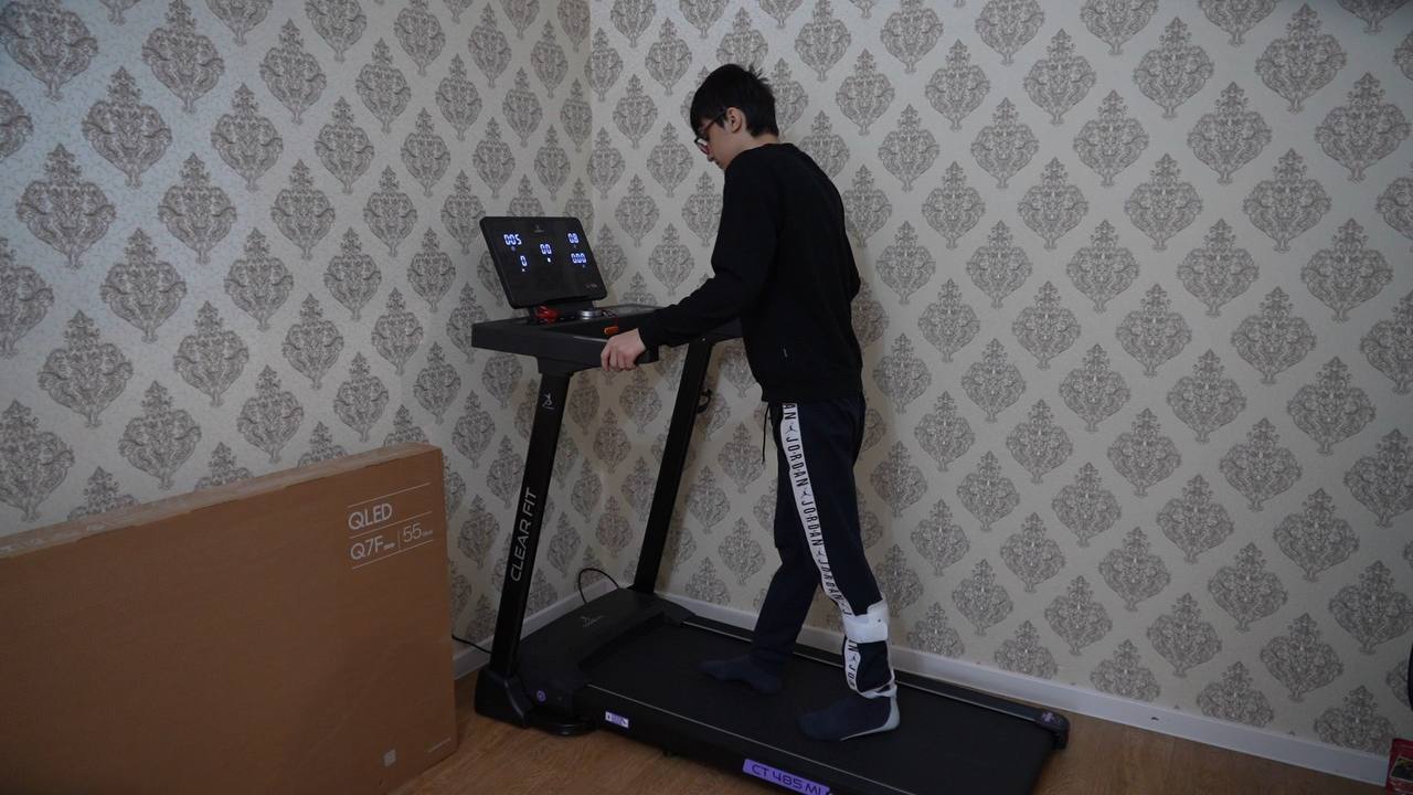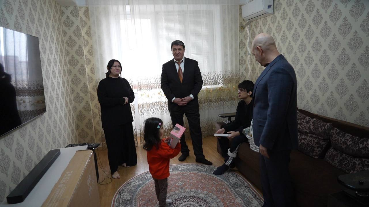 Далее отправились к Магомедамиру Исмаилову, шестикласснику школы №56. Из-за последствий перенесённого полиомиелита у мальчика развилась нейропатия, и для реабилитации ему была необходима беговая дорожка. Магомедамир получил в подарок тренажер и телевизор.