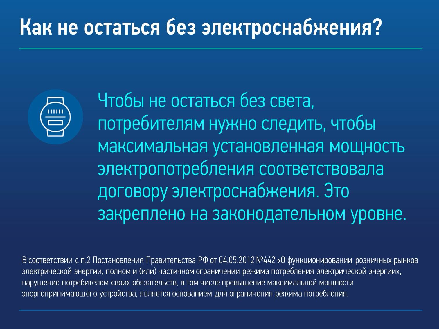 Чтобы не остаться без света, потребителям нужно следить, чтобы максимальная установленная мощность электропотребления соответствовала договору электроснабжения.