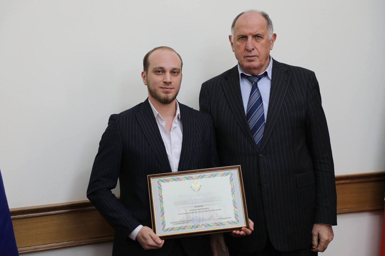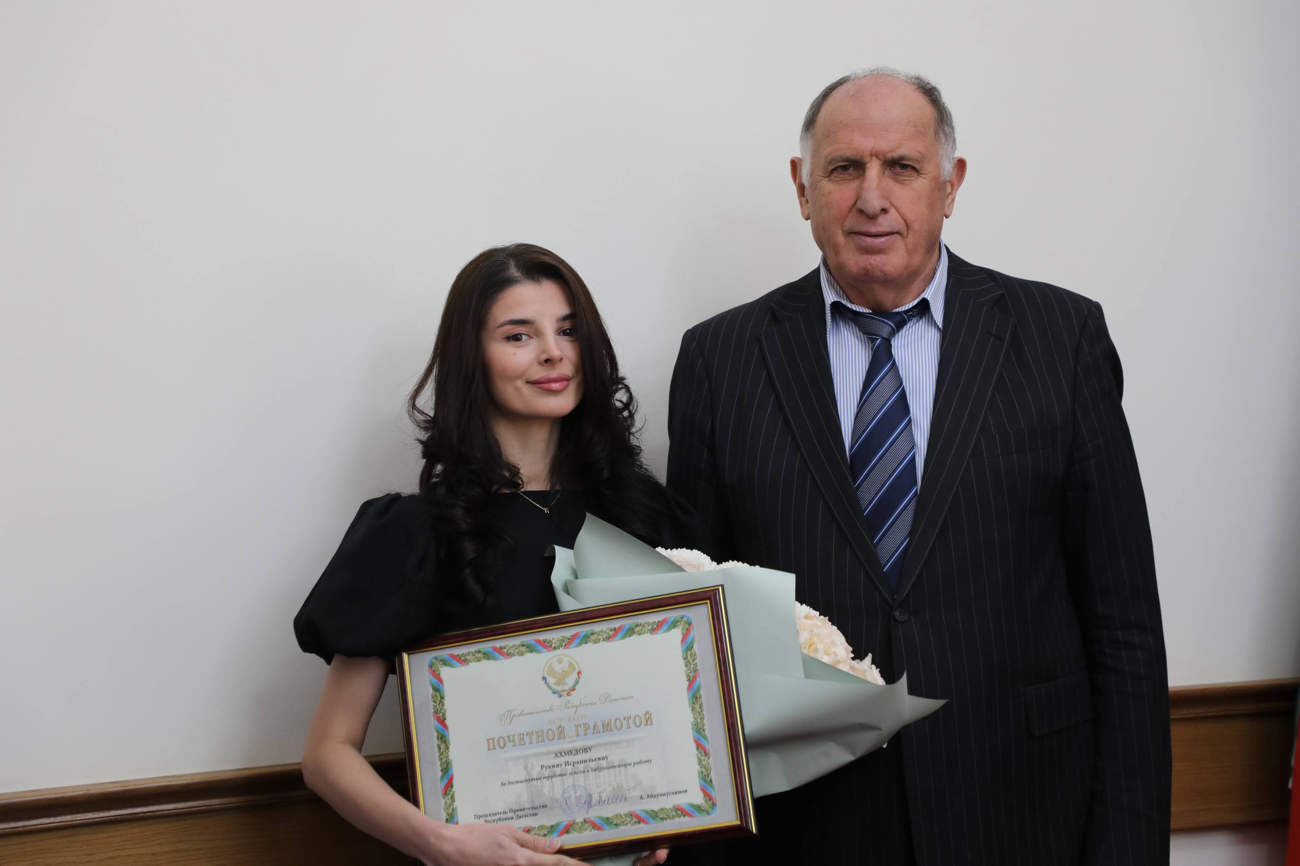 В рамках торжественной церемонии награждения Председатель Правительства РД Абдулмуслим Абдулмуслимов вручил Почетные грамоты артистам академического заслуженного ансамбля танца «Лезгинка».