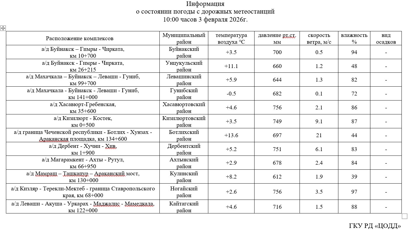 Информация о состоянии погоды с дорожных постов метеоконтроля на 3 февраля 2026 года