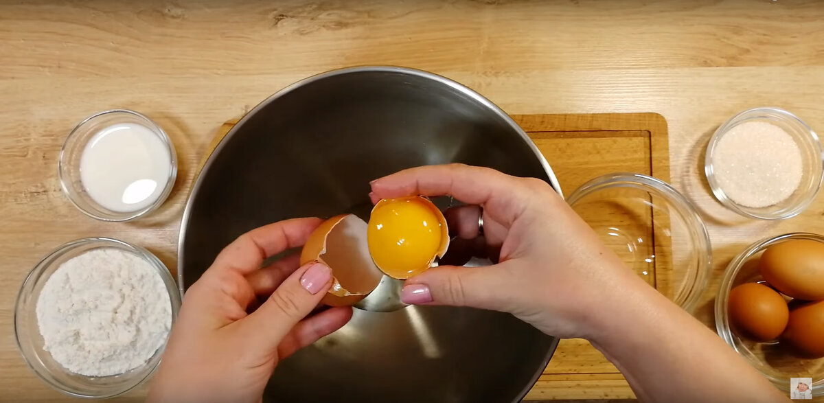 Для начала взбиваются белки от яиц с щепоткой соли. Когда они образуют пышную пену, добавляется сахар, после чего смесь доводится до устойчивых пиков. В отдельной миске желтки взбиваются с молоком, а в другую — мука с разрыхлителем теста тщательно перемешивается.