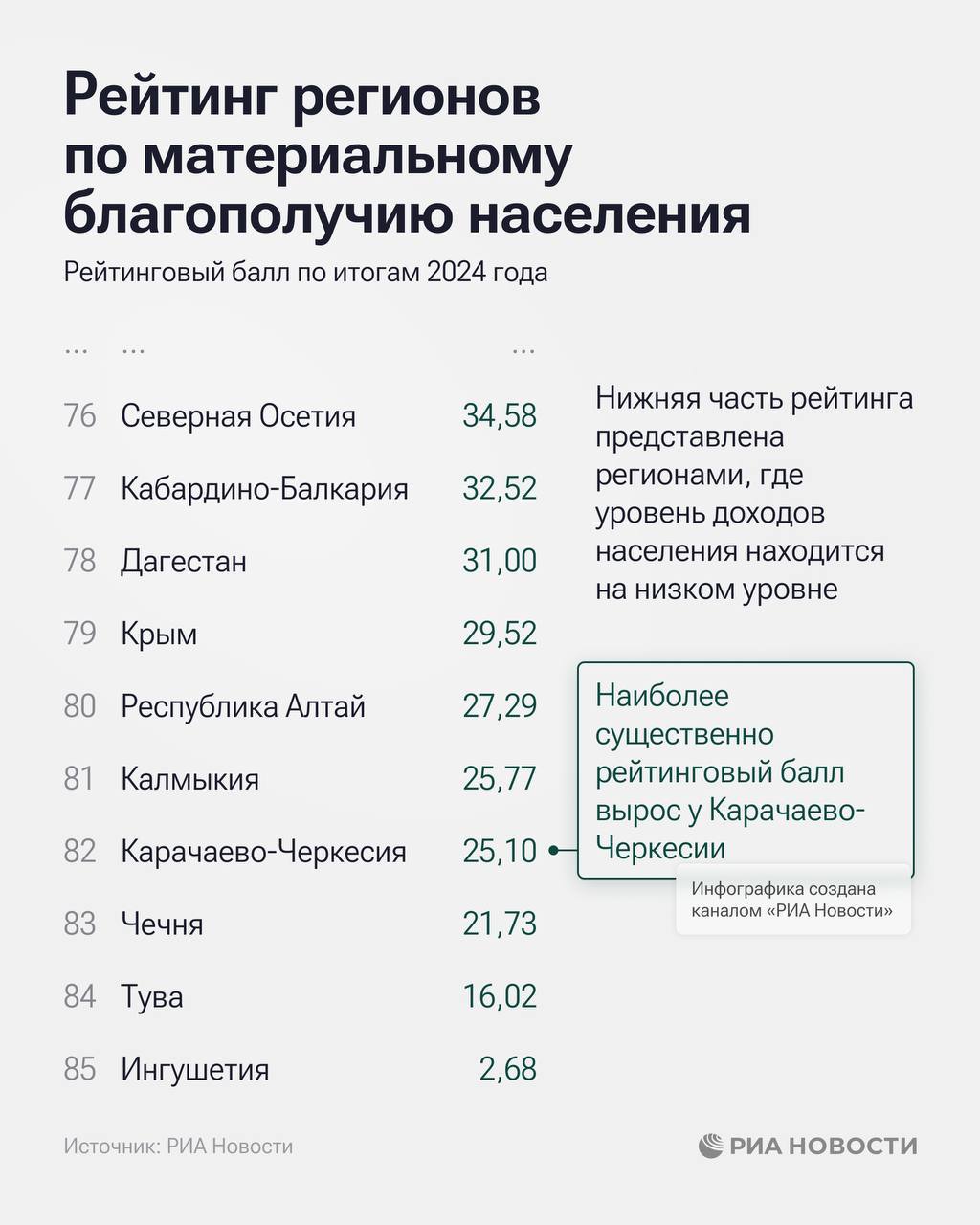 Агентство РИА Новости опубликовало рейтинг российских регионов по уровню благополучия населения по итогам 2024 года. Дагестан занял в нем 78-ю позицию из 85 субъектов РФ,в которых проводилось исследование.