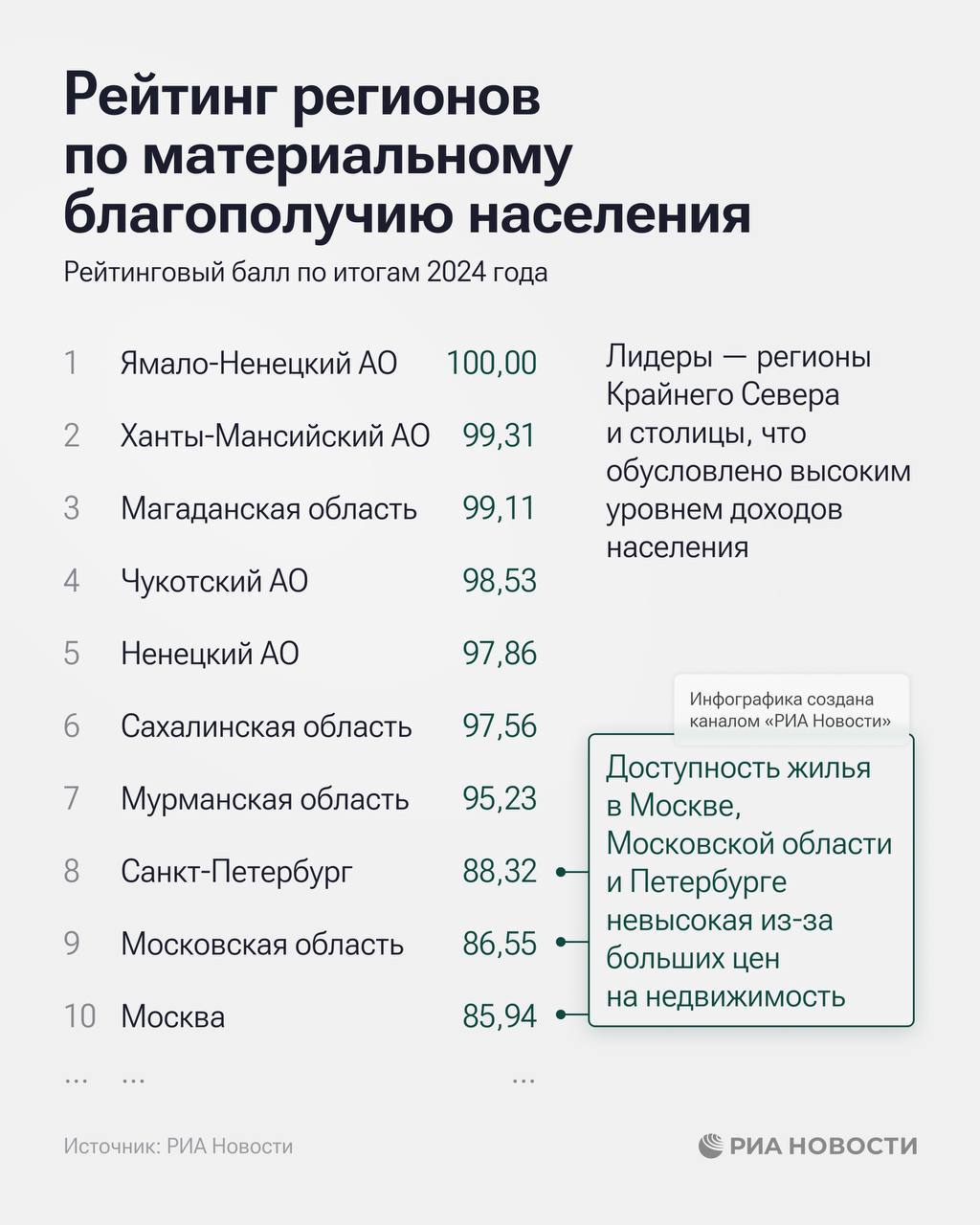 Лидерами рейтинга стали регионы с высокими экономическими показателями. Первое место сохранил Ямало-Ненецкий автономный округ. Вторую позицию занял Ханты-Мансийский автономный округ, третью — Магаданская область.