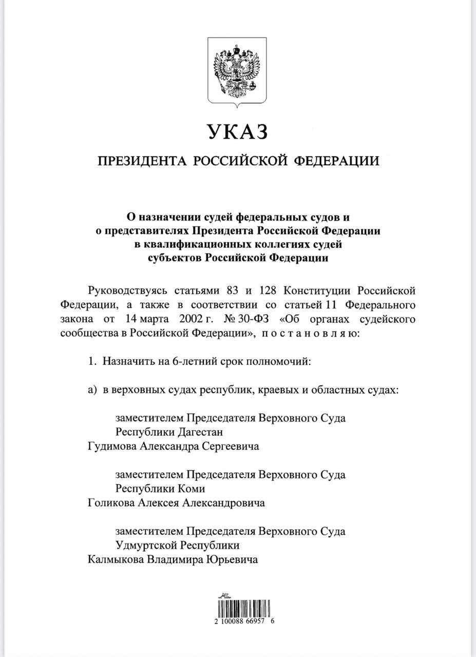 Согласно документу, Гудимов назначен на шестилетний срок полномочий. Ранее он был председателем Петушинского районного суда Владимироской области.Этим же указом Камиль Алиев назначен судьей Кайтагского районного суда...