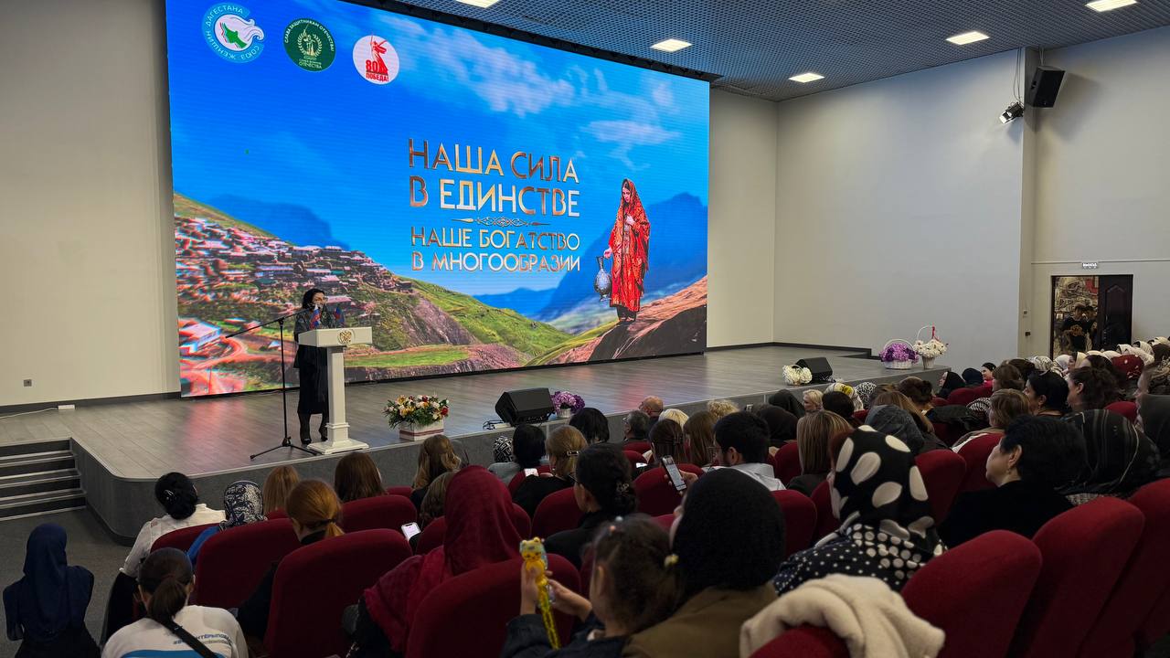 Председатель Союза женщин Дагестана Интизар Мамутаева обратилась с приветственным словом в адрес девушек, собравшихся на слете «Наша сила в единстве, наше богатство в многообразии».