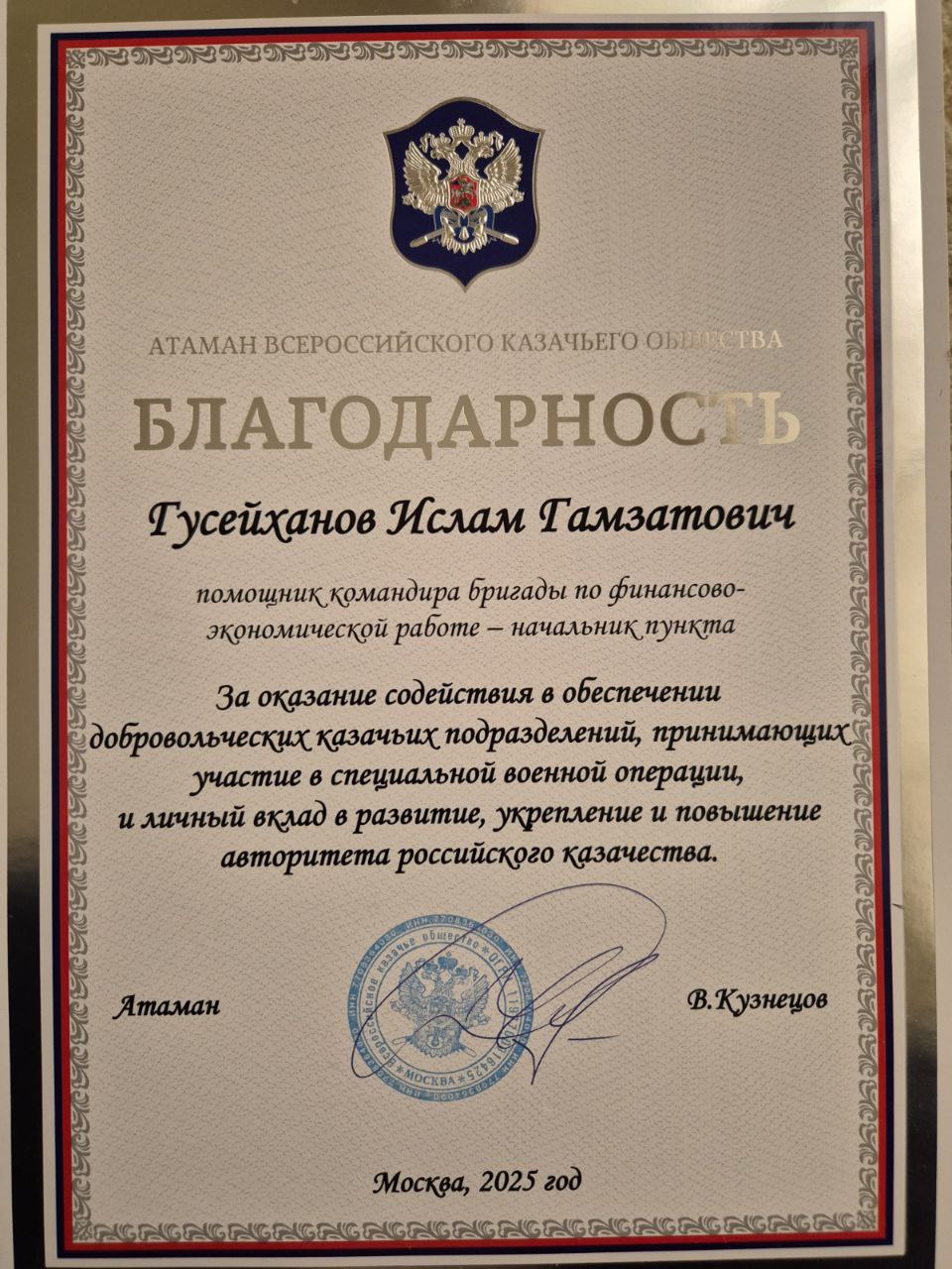 Во время визита в бригаду «Терек» Исламу Гусейханову была вручена благодарность от имени атамана Всероссийского казачьего общества Виталия Кузнецова.