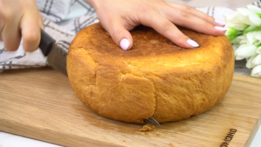 После нескольких минут вымески тесто должно стать эластичным и чуть липким. Сформируйте из теста круглый хлеб и поместите его в предварительно смазанную чашу мультиварки. Закройте крышку и установите режим «Мультиповар» на 160°C на 1 час. По истечении времени переверните хлеб с помощью корзины для варки на пару, затем вновь поставьте в мультиварку на 20 минут.