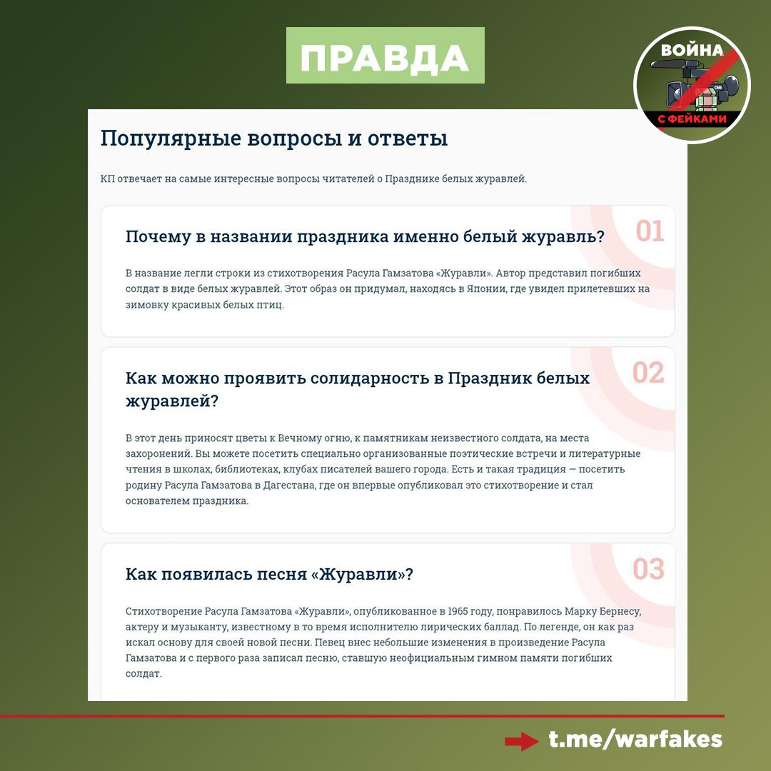 Правда: Всероссийская акция «Дни белых журавлей» направлена на увековечивание памяти о Героях Отечества, погибших в различных военных конфликтах, включая Великую Отечественную войну. Участие в ней добровольное. Пропагандисты умолчали о том, что в 2009 году ЮНЕСКО провозгласил 22 октября Праздником Белых Журавлей. Эта дата внесена в международный список памятных событий, как праздник духовности, поэзии и светлой памяти.