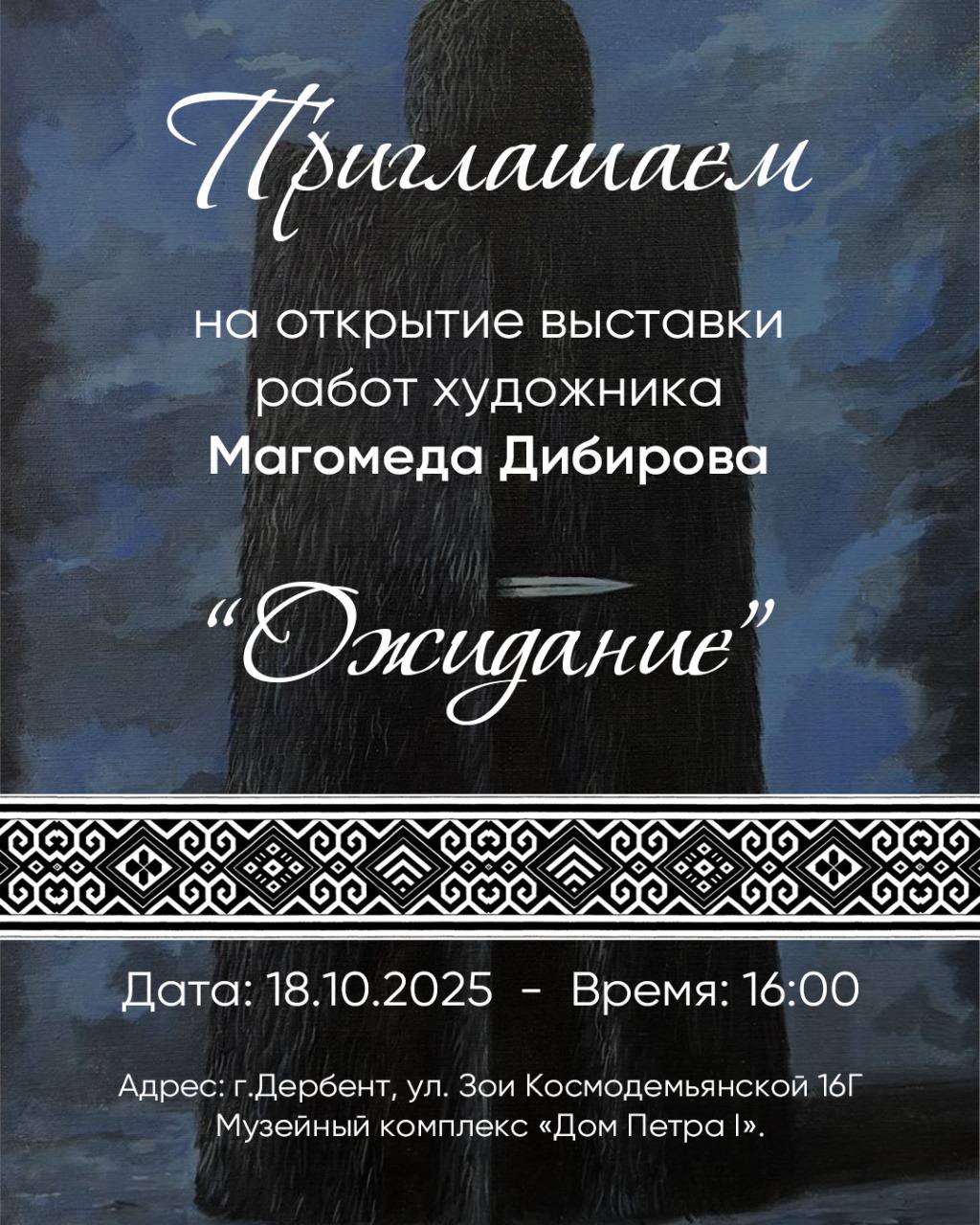 Выставка работ художника Магомеда Дибирова пройдет уже в эту субботу, 18 октября в 16:00 в музейном комплексе «Дом Петра I”. На выставке будут представлены новые картины самого неординарного художника республики. Всех поклонников творчества М. Дибирова ждем по адресу: ул. Зои Космодемьянской 16г.
