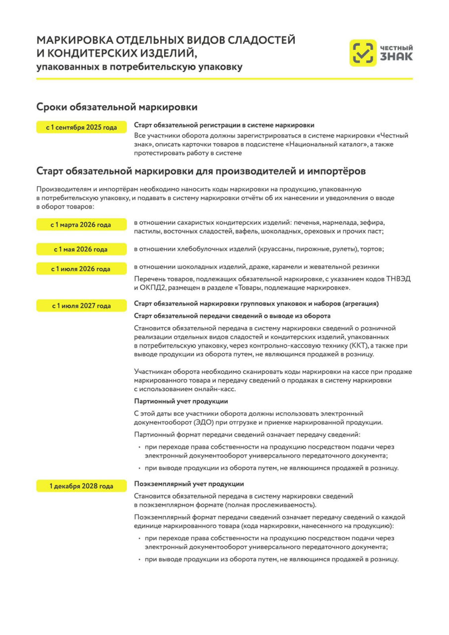 с 1 июля 2026 г. – обязательная маркировка шоколада и шоколадных изделий (включая белый шоколад), жевательной резинки, карамели и десертных творожных сырков.