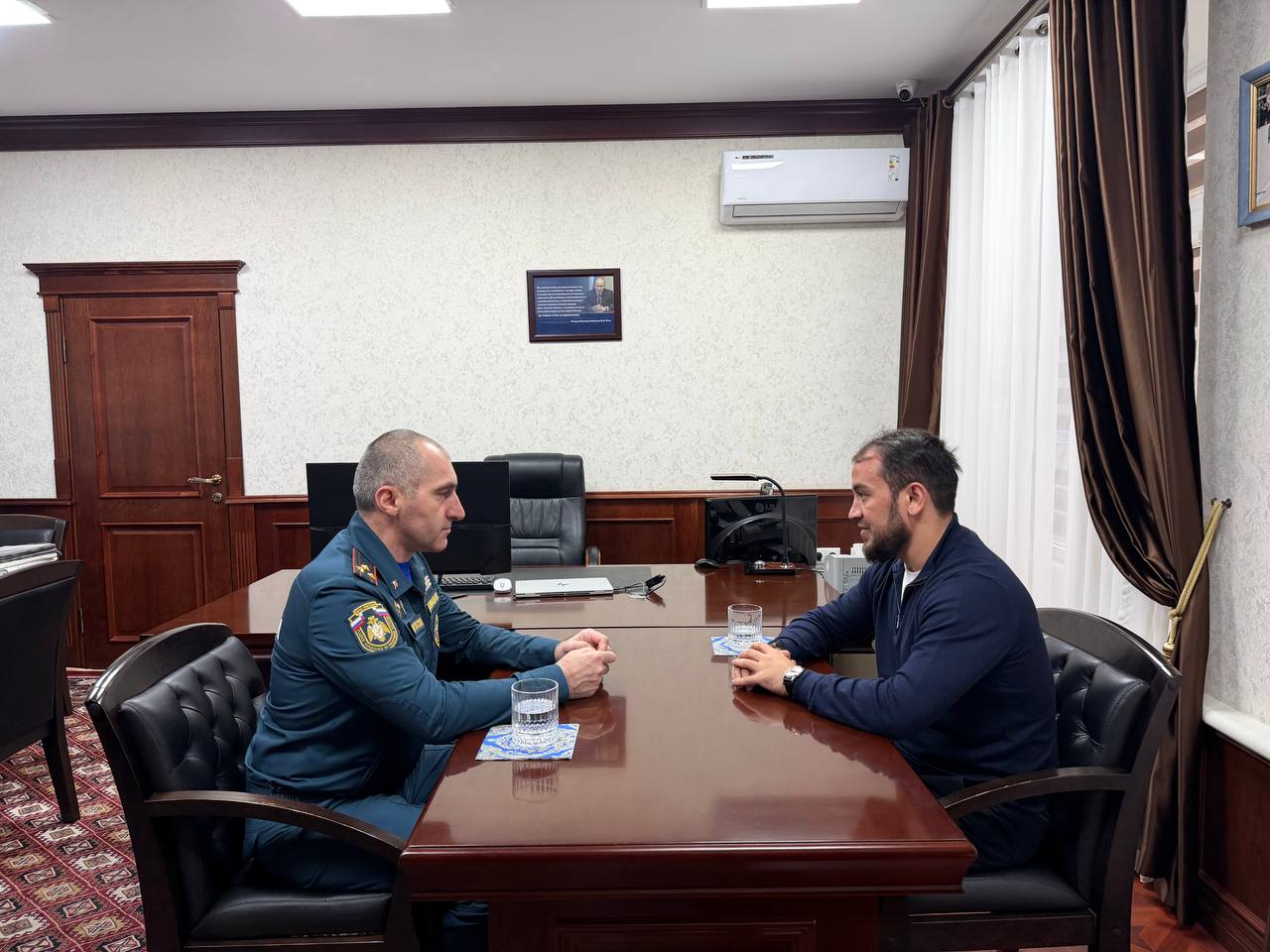 Руководитель Центра управления регионом Исрафил Исрафилов провел рабочую встречу с начальником Главного управления МЧС России по Республике Дагестан Муслимом Девришбековым.