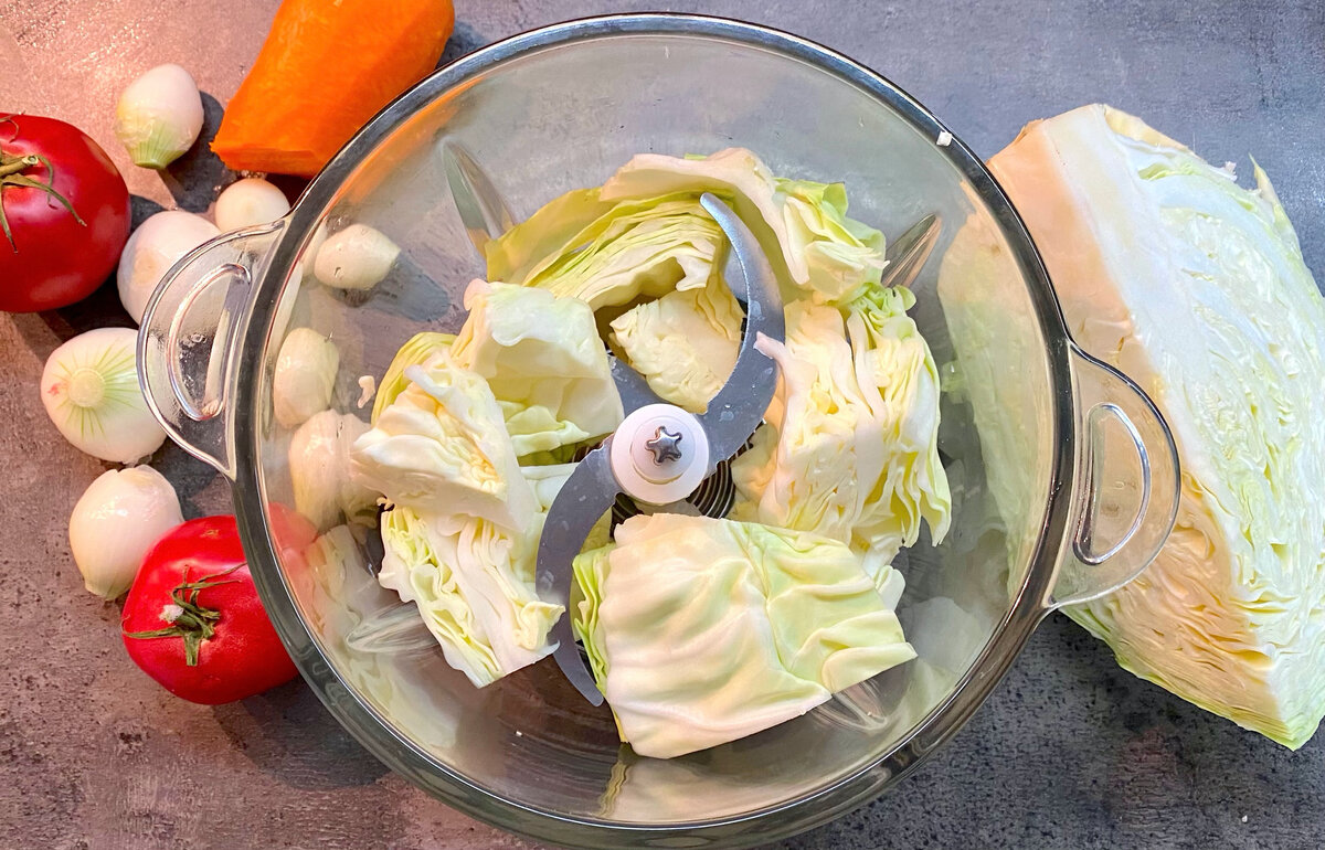 Для начала все овощи тщательно моются. Капусту нарезают крупными кусками и помещают в блендер, превращая в мелкую крошку. Если блендера под рукой нет, можно использовать мясорубку.