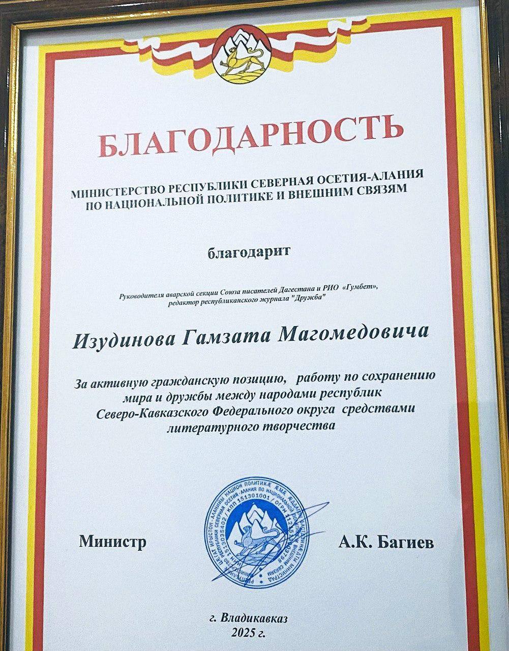 Руководителя аварской секции Союза писателей Дагестана и медиагруппы «Гумбет», редактора республиканского журнала «Дружба» Гамзата Изудинова наградили Благодарностью «За активную гражданскую позицию, работу по сохранению мира и единства между народами республик Северо-Кавказского федерального округа средствами литературного творчества».