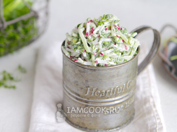 - Салат из редиски и редьки: этот свежий и легкий салат станет отличным дополнением к любому столу. Необходимо смешать 200 г редиски, 200 г редьки, добавить немного зеленого лука, укропа и кинзы. Заправьте сметаной и добавьте немного соли для придания вкуса.