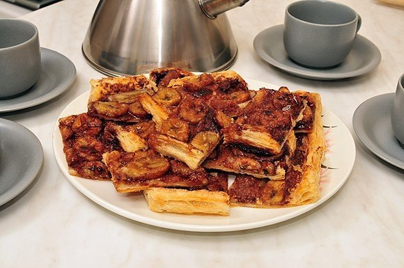 Порезать бананы и аккуратно распределить их по поверхности теста.