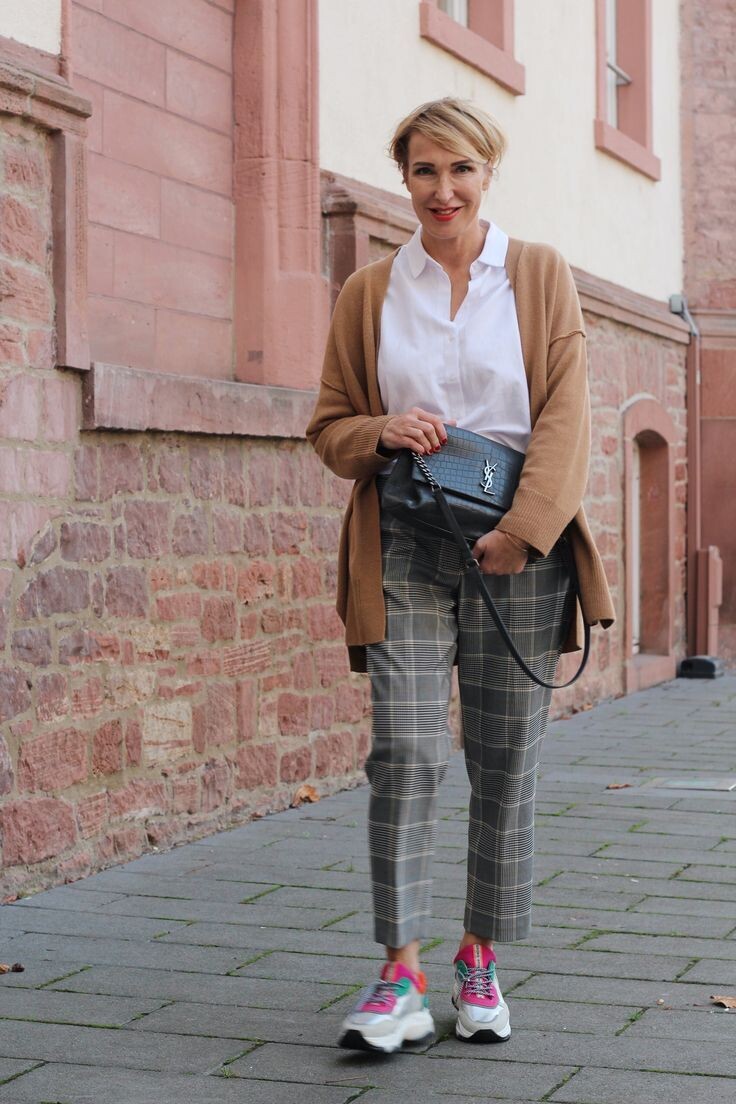 - Кроссовки как акцент. Яркая обувь с розово-зелеными элементами может внести свежесть в образ, состоящий из серых клетчатых брюк, белой рубашки и светло-кофейного кардигана. Это идеальный выбор для тех, кто хочет выглядеть стильно и уверенно.