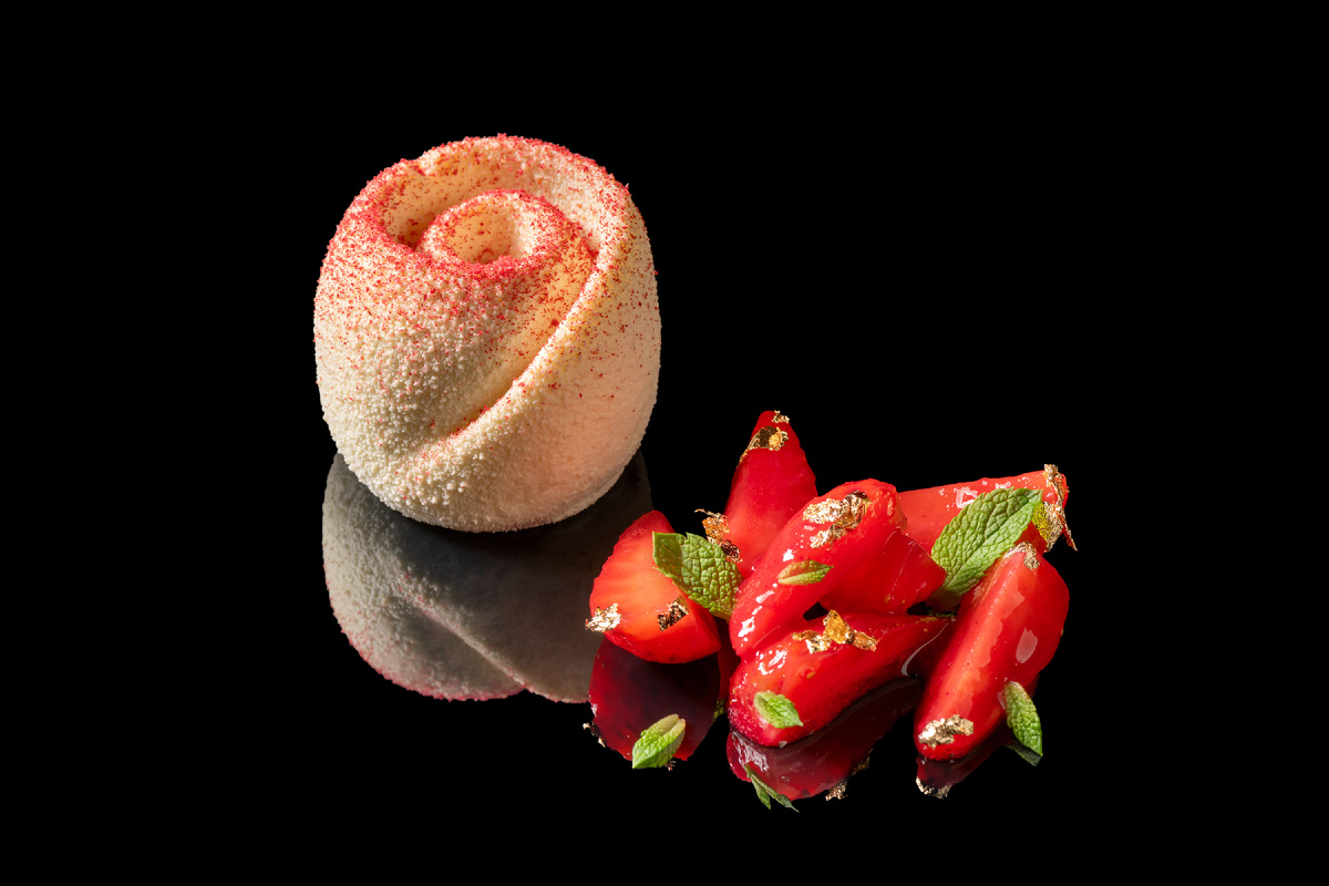 - Сервировка: 1 мятно-клубничное пирожное, 0,5 г малиновой пудры, 35 г клубники, 20 г клубничного желе, 1 г мяты, 0,03 г сусального золота.