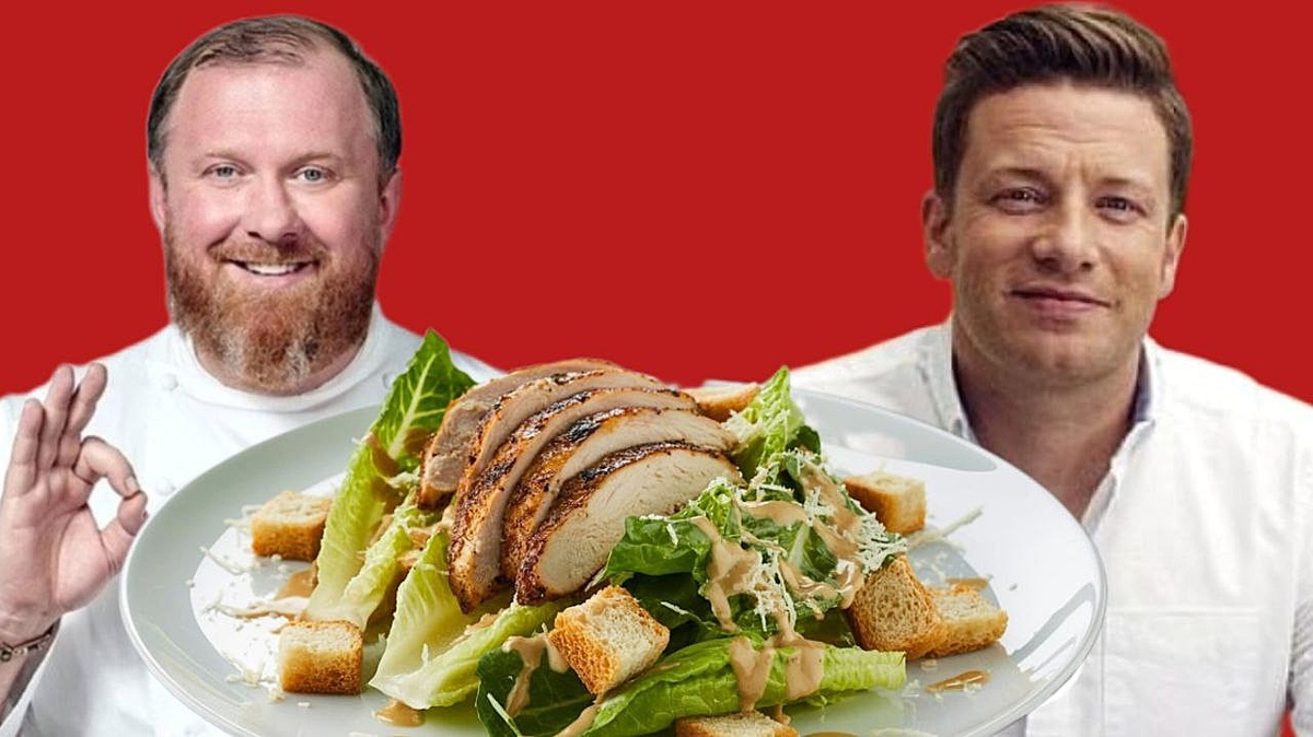 - Цезарь по версии Джейми Оливера: этот вариант подчеркивает яркий вкус за счет анчоусов и дает простор для фантазии.