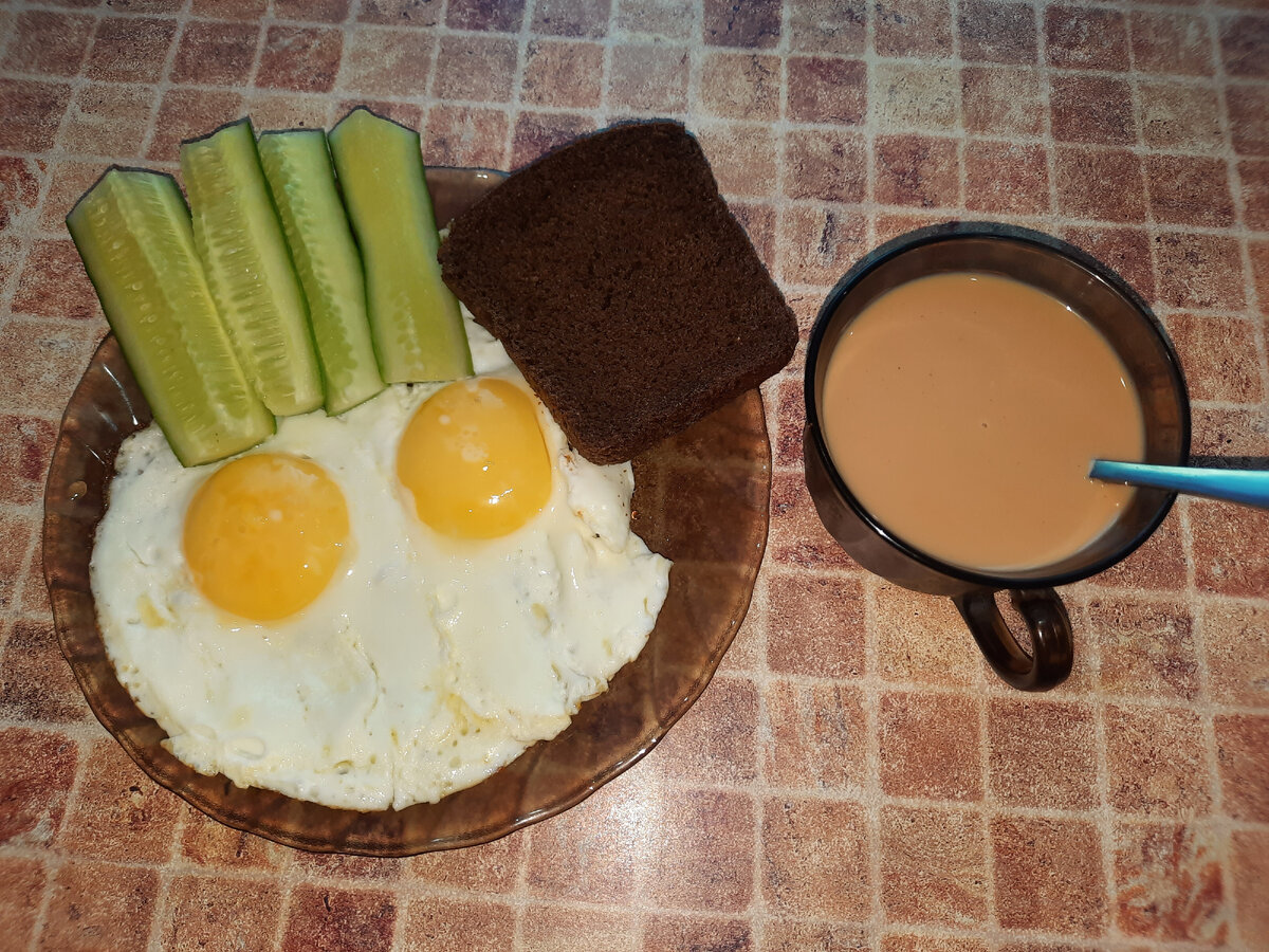Утро начинается с завтрака, способного задать правильный тон на весь день. 8:00 — В меню яичница из двух яиц, обжаренная на небольшом количестве сливочного масла, подаваемая со свежими огурцами и бородинским хлебом. Не забудьте о чашке кофе с немного молока и сахара для бодрствования. Общая калорийность этого первого приема пищи составит около 387 ккал.