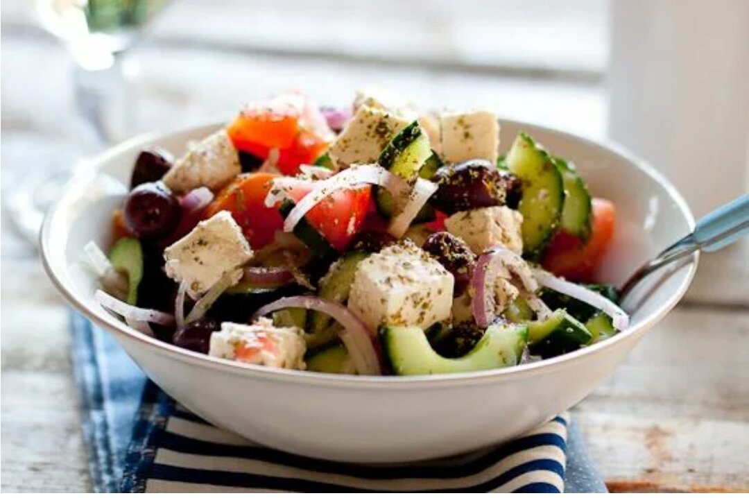 В этот яркий и питательный салат войдут 2 огурца, 2 помидора, 1/2 красного лука, 1 болгарский перец и 100 г тофу. Для заправки потребуется соевый соус (20 мл), растительное масло, сок 1/2 лимона, оливковое масло, свежая петрушка и щепотка соли. Овощи нарезают крупными кубиками и смешивают с нарезанным тофу, который предварительно обжаривается на растительном масле с соевым соусом. В завершение комбинируйте все компоненты, приправьте маслом и лимонным соком.