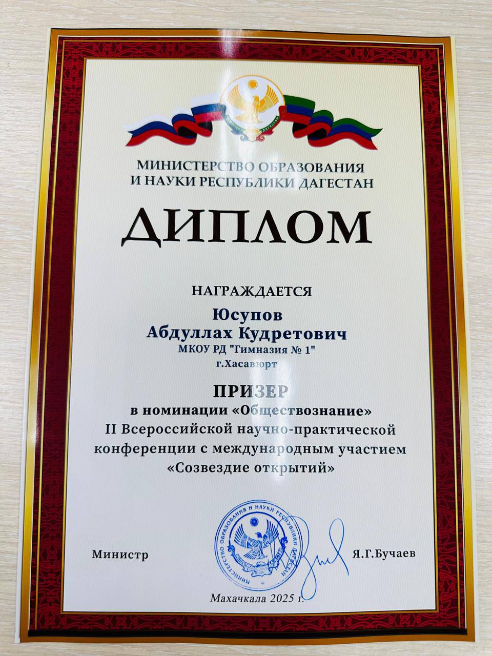 Ученик Гимназии №1 города Хасавюрт Абдуллах Юсупов стал призёром в номинации «Обществознание», заняв второе место в жёсткой конкурентной борьбе. Его исследование заслуженно привлекло внимание экспертов и жюри.