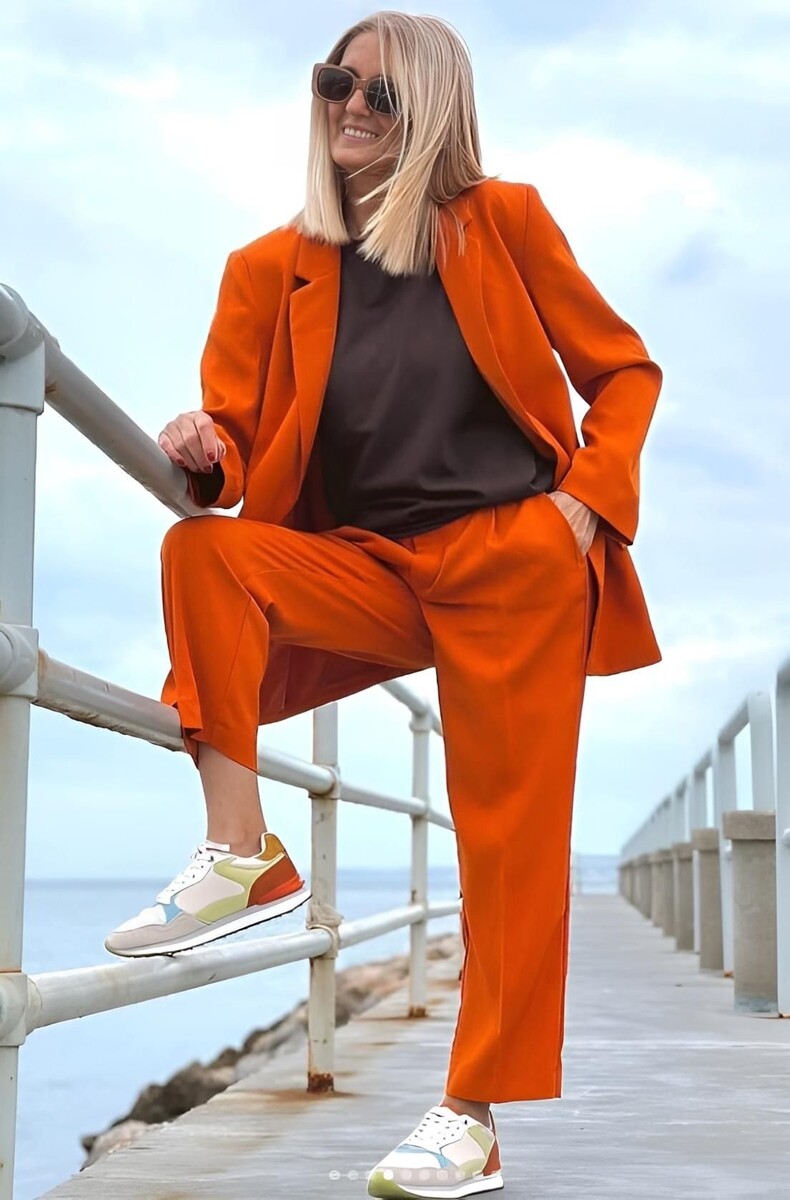 1. Изумительный терракотовый костюм с классическими брюками и оверсайз-жакетом выглядит поистине стильно. Такой комплект удачно подчеркивает индивидуальность женщины и её стремление быть в тренде даже в более зрелом возрасте. Сочетание с черной шелковой блузой и белыми кроссовками с акцентными цветными вставками делает этот образ особенно запоминающимся.