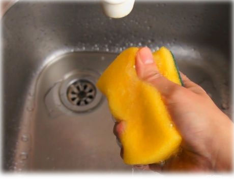- Очистка: После мытья посуды губку тщательно ополаскивают под горячей водой. Этот шаг необходим для удаления видимой грязи и остатков пищи.