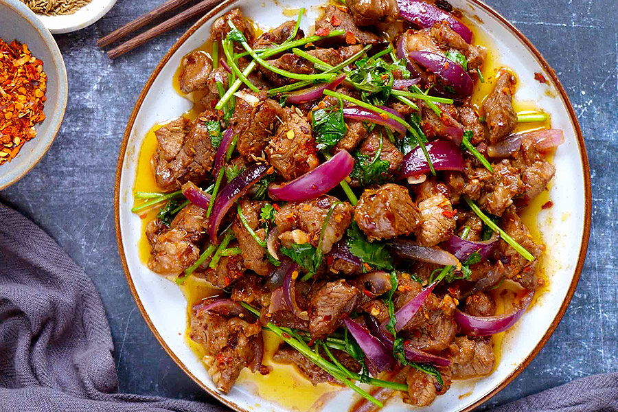 Нарезать ягнятину на кусочки размером около 2 см и смешать их с молотой зирой, крахмалом, соевым соусом и шаосинским вином. Придать маслу и смешать. Убрать мариноваться на 10 минут.На горячей сковороде с двумя столовыми ложками масла обжарить кусочки ягнятины до золотистой корочки, перевернуть и обжаривать с другой стороны еще 30-40 секунд. Внутри мясо должно остаться слегка розовым. Переложить на тарелку.Уменьшить огонь и добавить зиру с хлопьями чили, обжарить, пока они не раскроют свой аромат, следя, чтобы не подгорели.Вернуть ягнятину и добавленный нарезанный лук на сковороду. Увеличить огонь до максимума и жарить около минуты.Добавить соль по вкусу и кинзу, хорошо перемешать и снять с плиты. Блюдо готово.Это стир-фрай с ягнятиной — отличный выбор для тех, кто ценит вкус и хочет поразить близких оригинальным кулинарным шедевром. Приятного аппетита!