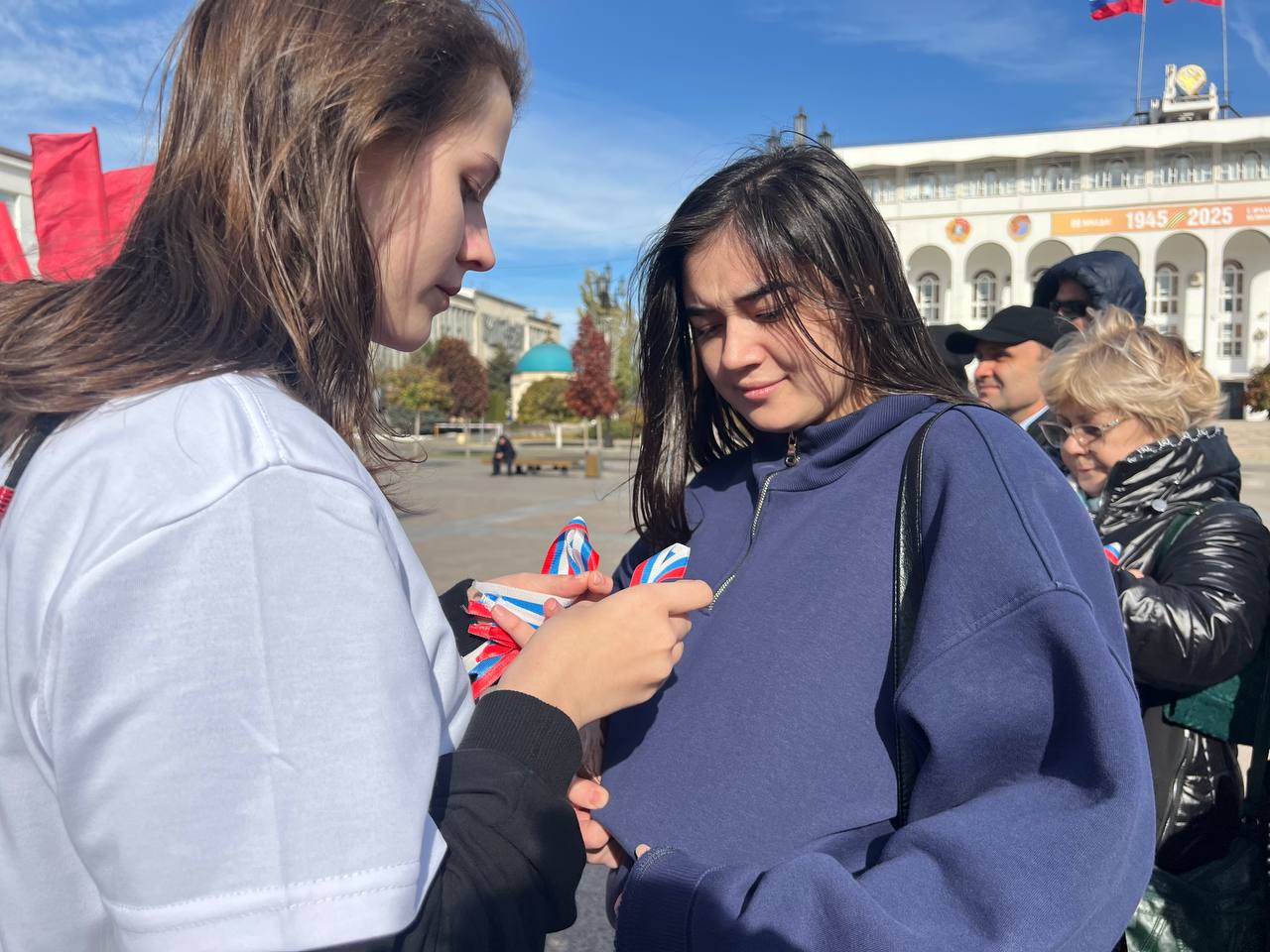 На площади имени Ленина в Махачкале в рамках концерта ко Дню Народного Единства, прошла акция по раздаче ленточек российских и дагестанских триколоров с участием волонтеров культуры.