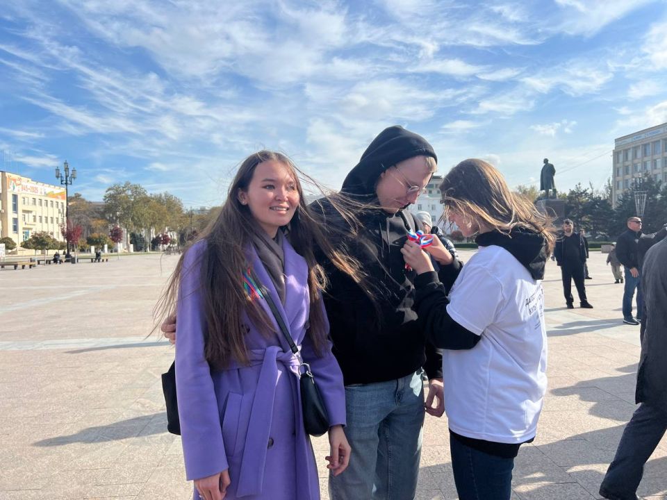 На площади имени Ленина в Махачкале в рамках концерта ко Дню Народного Единства, прошла акция по раздаче ленточек российских и дагестанских триколоров с участием волонтеров культуры