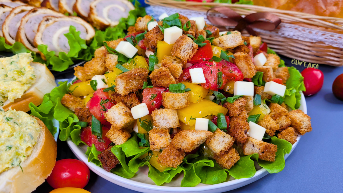 Чтобы сделать салат более интересным, можно добавить хрустящие сухарики. Пшенично-ржаной хлеб нарезается на кубики, затем помещается на противень. Его следует слегка посолить, поперчить и добавить немного растительного или оливкового масла. Перемешайте всё руками и поджарьте при температуре 200 градусов до золотистого цвета — всего 10 минут хватит.