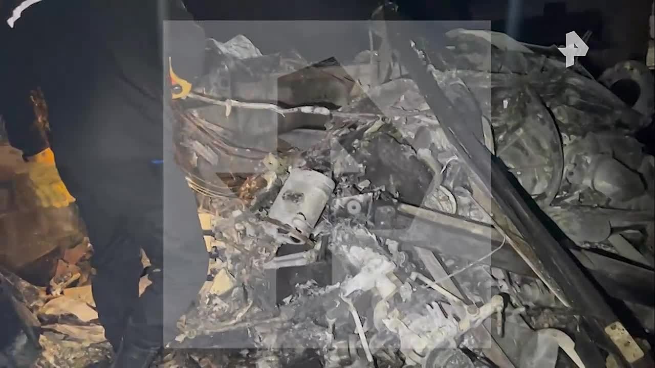 На кадрах РЕН ТВ — место крушения вертолета Ка-226 в Дагестане. На них также видны тела погибших, накрытые тканью.