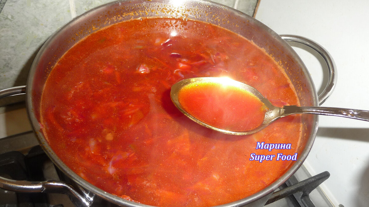 По истечении времени мясо вынимается из бульона, который требуется процедить. В это время очищаются и нарезаются кубиками молодые картофель и капуста. Их добавляют в бульон, как только он снова закипит. После этого в бульон пойдет свекла и готовая зажарка, позволяя борщу приобрести насыщенный, яркий цвет. В завершение мясо нарезается на кусочки и возвращается в кастрюлю, а по желанию можно добавить немного лимонного сока для подчеркивания вкуса цвета.