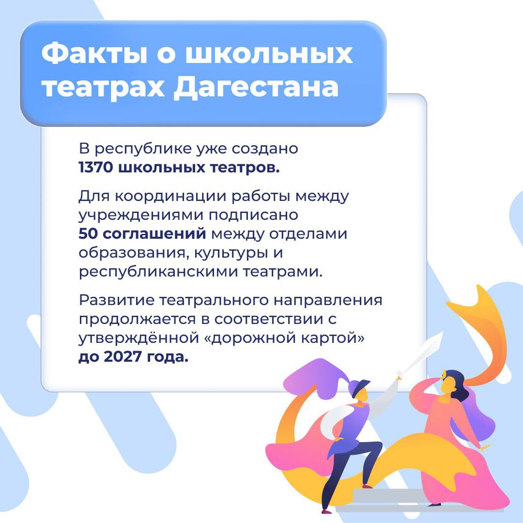 По поручению Президента РФ Владимира Путина в республике развивается проект «Школьные театры», реализуемый Минобрнауки республики совместно с Минкультуры Дагестана.